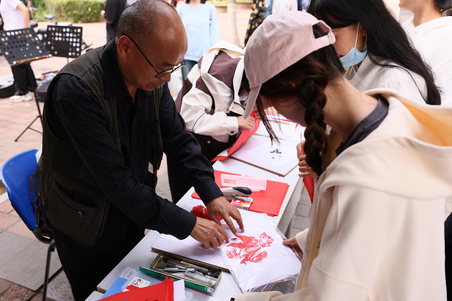 民族文化展覽體驗(yàn)區(qū),同學(xué)們體驗(yàn)形式多樣的民族特色活動(dòng)。展品區(qū),同學(xué)們試戴精美的民族特色帽子拍照打卡留念。文化區(qū),體驗(yàn)毛筆書法,藏文書法和剪紙,感受悠久燦爛的中華民族文化。游戲區(qū),同學(xué)們在體驗(yàn)中學(xué)習(xí),在交流中交融,編織了北工商一幅幅手足相親的民族團(tuán)結(jié)畫卷。