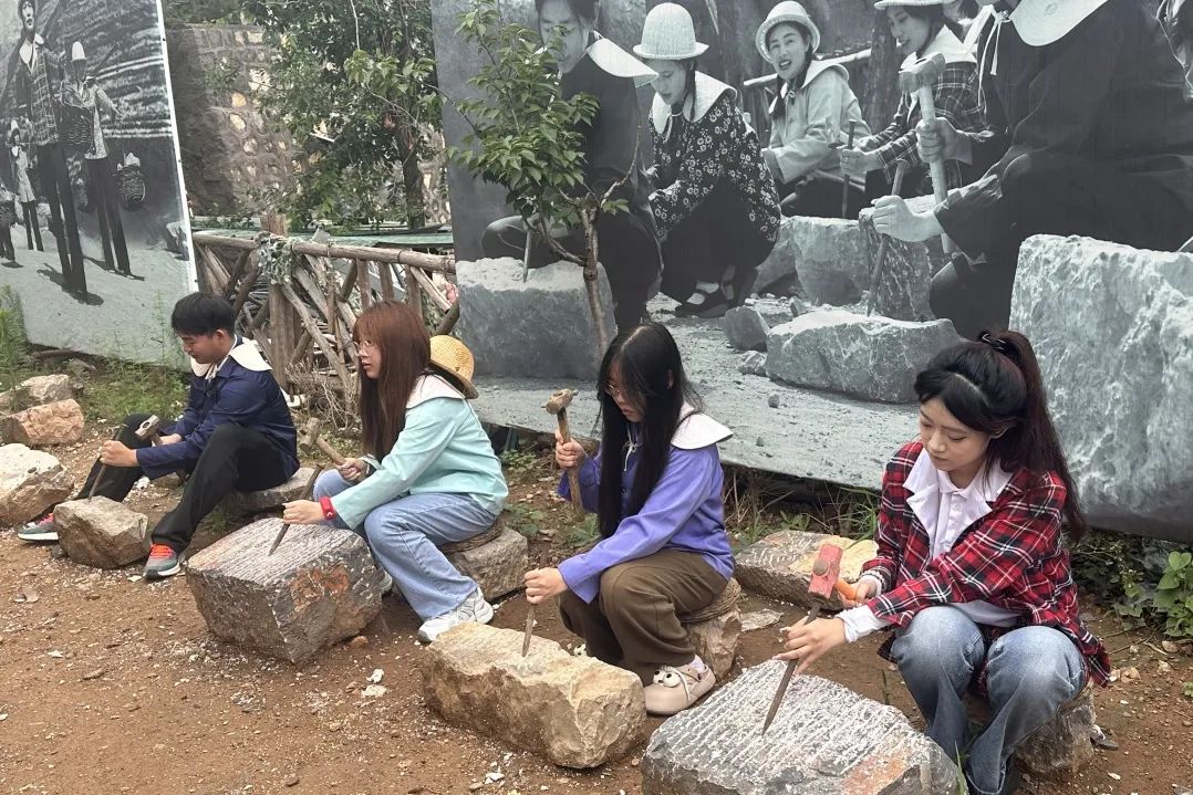 在河南林州紅旗渠,數(shù)學(xué)與統(tǒng)計學(xué)院“復(fù)興征程先鋒團”和馬克思主義學(xué)院的師生們,駐足于珍貴的歷史照片和實物面前。銹跡斑斑的鋼釬、布滿補丁的工裝,無聲地訴說著“十年修一渠”的壯舉:1250座山頭被削平,1525公里渠線蜿蜒成“人工天河”。在青年洞前,成員們觸摸著懸崖鑿痕,面向黨旗莊嚴宣誓,與當(dāng)年青年突擊隊的吶喊隔空呼應(yīng)。走進水電站,他們掄錘扛石、采集數(shù)據(jù),沉浸式體驗建渠的艱辛,讓專業(yè)知識扎根實地。沿著前輩們鑿石修渠的路線一路前行,親身感受戰(zhàn)天斗地的豪情壯志,深刻領(lǐng)悟“自力更生、艱苦創(chuàng)業(yè)、團結(jié)協(xié)作、無私奉獻”的紅旗渠精神。
