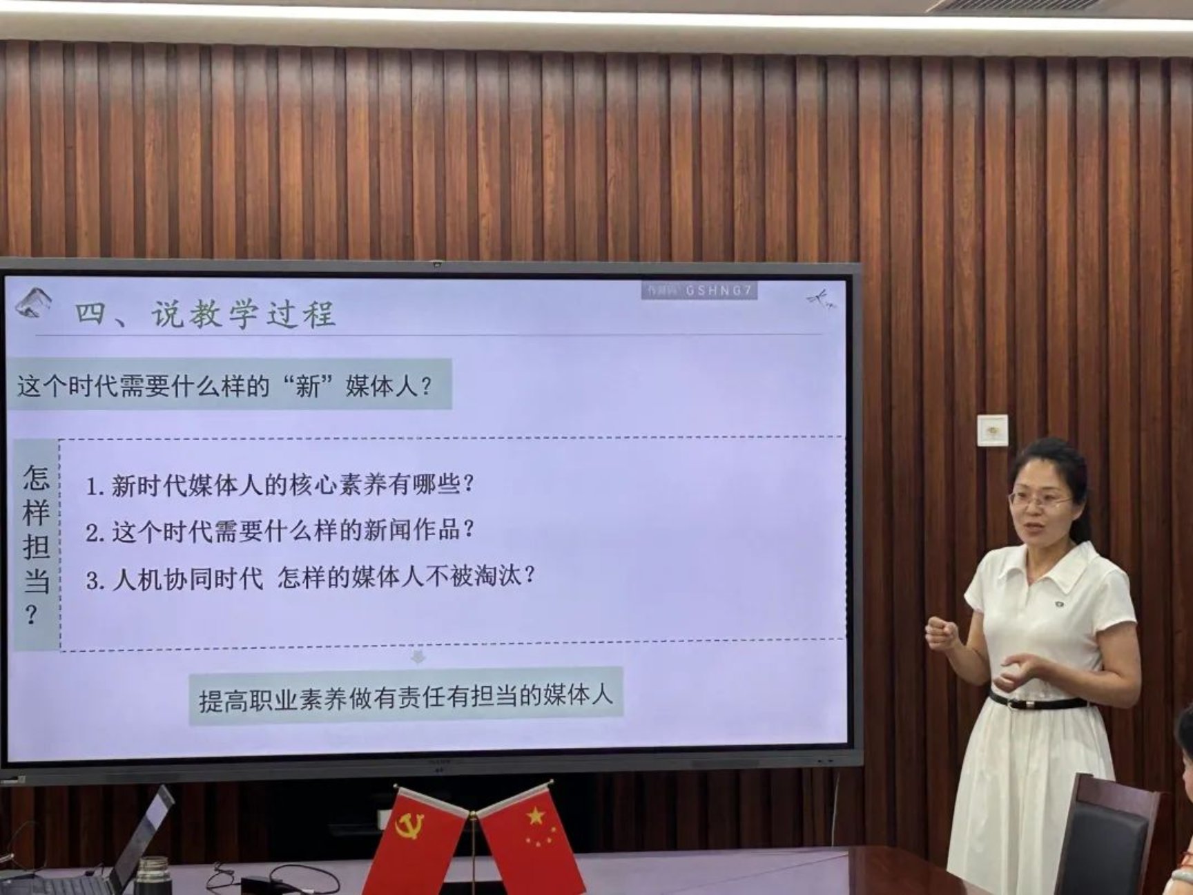 姜茹茹聚焦如何給“新傳”專業(yè)學(xué)生講好“時(shí)代責(zé)任擔(dān)當(dāng)”。她從教材內(nèi)容、學(xué)生學(xué)情和教學(xué)過程三個(gè)方面展開,在教材內(nèi)容方面,將緒論中標(biāo)題結(jié)合新聞傳播專業(yè)進(jìn)行轉(zhuǎn)換;在學(xué)生學(xué)情分析上,涵蓋了學(xué)生知識(shí)基礎(chǔ)、能力基礎(chǔ)以及情感價(jià)值觀情況;在教學(xué)過程中,將黨的十九大報(bào)告提出的,中華民族迎來(lái)了站起來(lái)、富起來(lái)、強(qiáng)起來(lái)的偉大飛躍,以更易于新傳學(xué)生接受的方式開展教學(xué)。