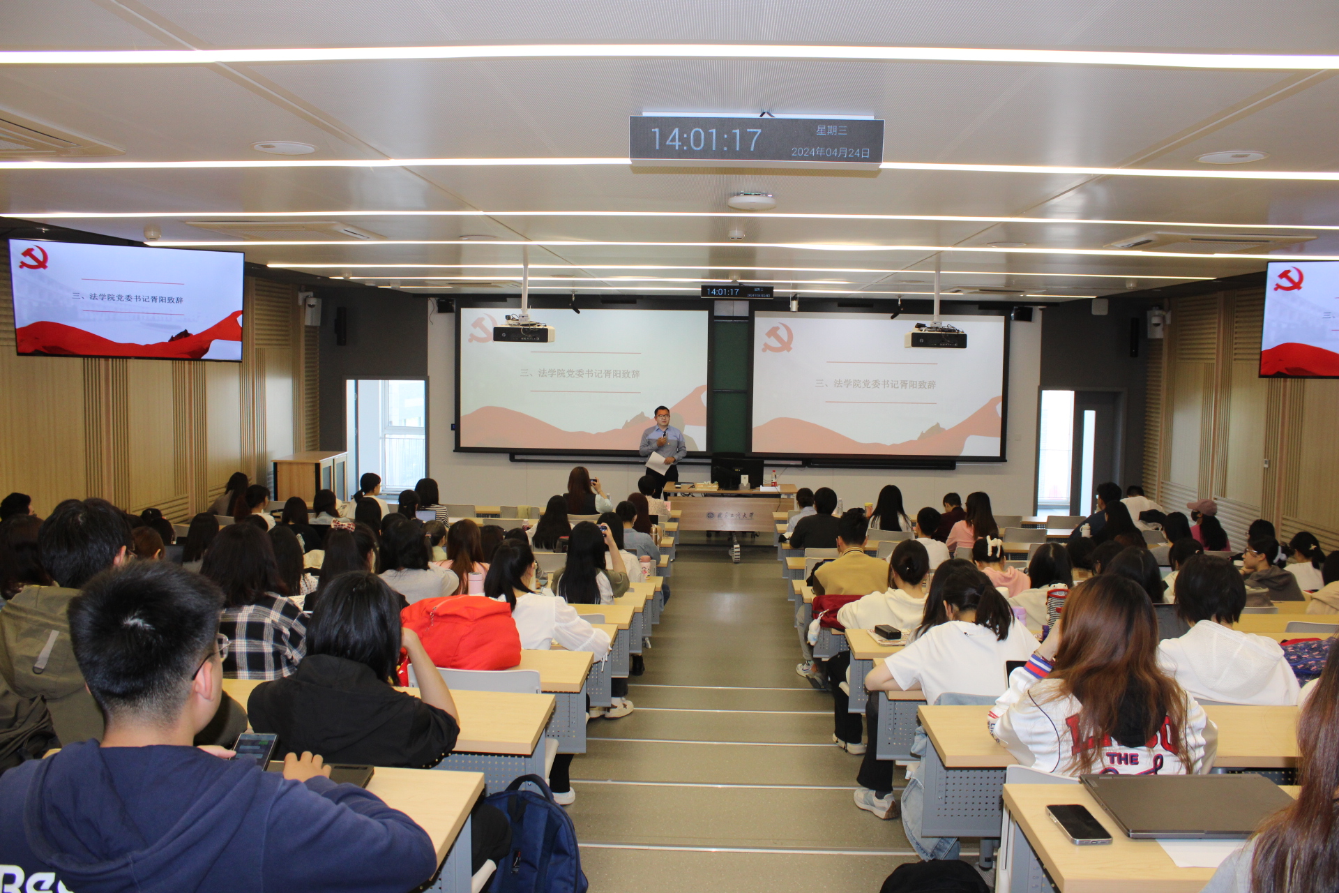 為深入學習貫徹習近平新時代中國特色社會主義思想,學思踐悟習近平文化思想,4月24日,法學院黨委舉辦“賞郵票、學中軸、瞰北京”主題黨日活動。北京市海淀區紫竹院郵政支局支局長董靜、北京市郵政教育培訓中心黨建和管理教研組長幺春元、我校法學院黨委書記胥陽,學生黨員、發展對象和入黨積極分子百余人參加。