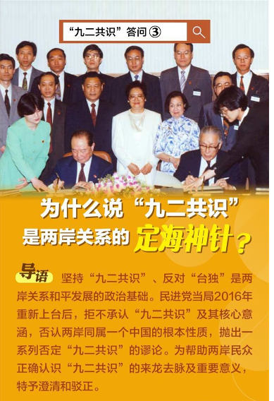 今年是“九二共識”三十周年。1992年,海協會與臺灣海基會經由香港會談及其后函電往來,達成了“九二共識”。“九二共識”的核心要義是“海峽兩岸同屬一個中國,共同努力謀求國家統一”。“九二共識”體現了兩岸同屬一個中國的歷史事實和法理基礎,是改善和發展兩岸關系的最大公約數。2008年至2016年,兩岸關系之所以能夠呈現和平發展局面,就是因為雙方在“九二共識”政治基礎上建立了基本的政治互信。2016年以來,兩岸關系之所以遭遇波折甚至出現動蕩,根源在于民進黨當局拒不承認“九二共識”,單方面破壞了兩岸關系和平發展的政治基礎。