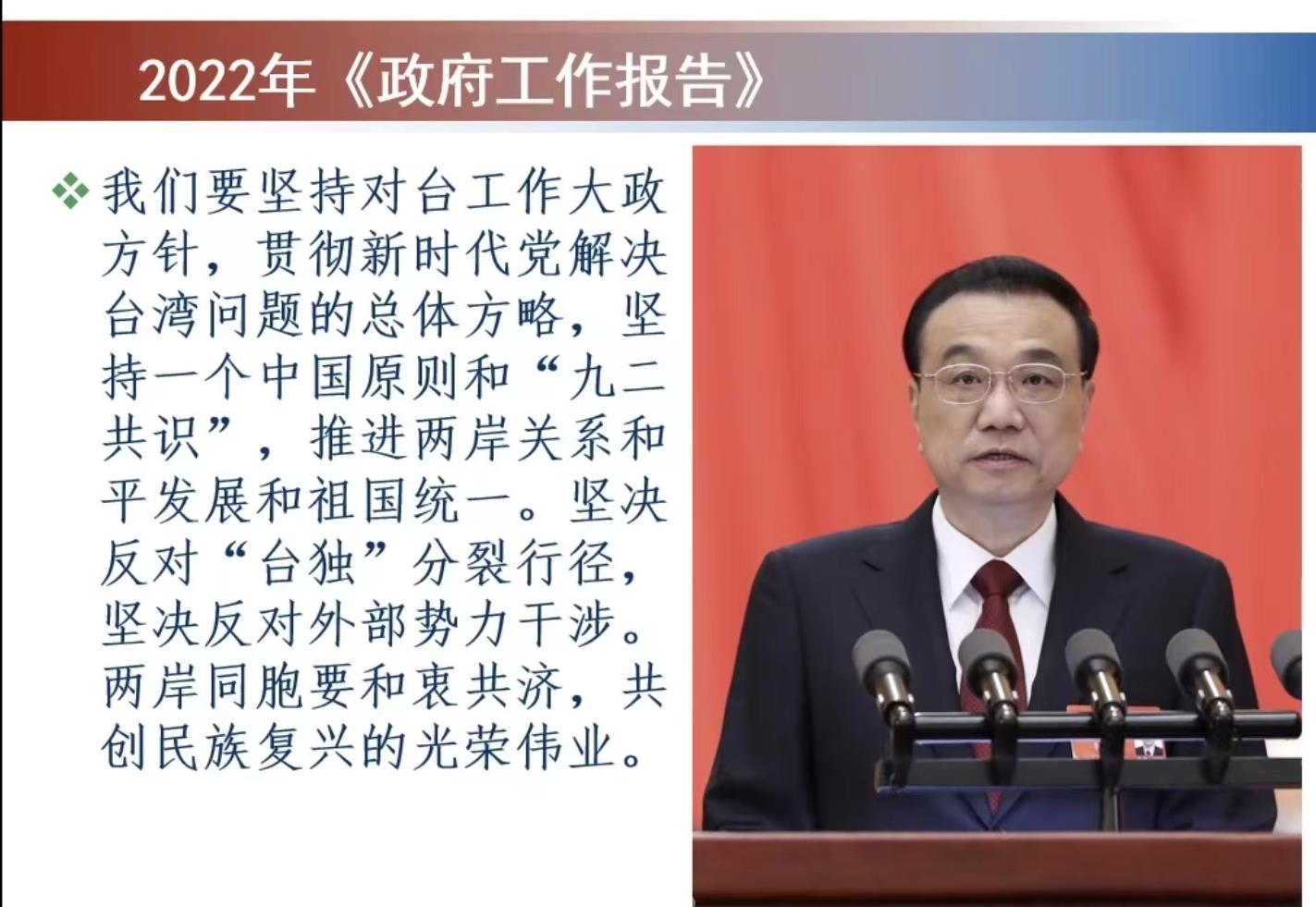 此次講座深化了同學們對今年兩會《政府工作報告》中的涉臺內容的理解。進入新時代,祖國統一、民族復興的歷史任務向兩岸青年發出新的號召。同學們表示,要與臺灣青年一起攜手并肩,立大志、明大德、成大才、擔大任,共同為實現祖國統一和民族復興的崇高事業集智聚力、接續奮斗。