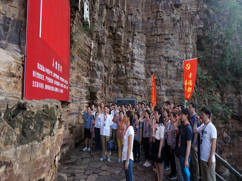 隨后,黨員們來到了紅旗渠的咽喉工程——“青年洞”,走在蜿蜒的渠道上,教師黨員們仿佛可以看到當年不怕犧牲的林州人民揮汗如雨的施工場面,切實體會到了林州人民在黨的領(lǐng)導下,不畏艱險十年修渠的奮斗歷程。在青年洞口食品學院黨委組織了重溫入黨誓詞儀式。通過體驗教學,大家都感嘆開鑿紅旗渠的偉大,危機面前找出路,敢想敢干,更加深刻的理解了“自力更生、艱苦創(chuàng)業(yè)、團結(jié)協(xié)作、無私奉獻”的紅旗渠精神。