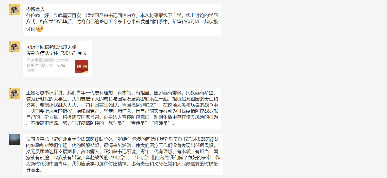 外國語學院團委為深刻學習貫徹習總書記為青年一代所強調的精神,聲援北大醫療隊,組織各班團支部在仔細閱讀回信內容后,積極開展線上學習分享活動。各班同學在班長、班團干部的帶領下通過自學、小組討論等方式認真學習了《習近平總書記給北京大學援鄂醫療隊全體“90后”黨員回信》內容。通過學習,同學們深刻理解了習近平總書記在回信中所表達的深刻內涵和對90后新時代青年給予的殷切希望,并在班級群內分享學習心得。