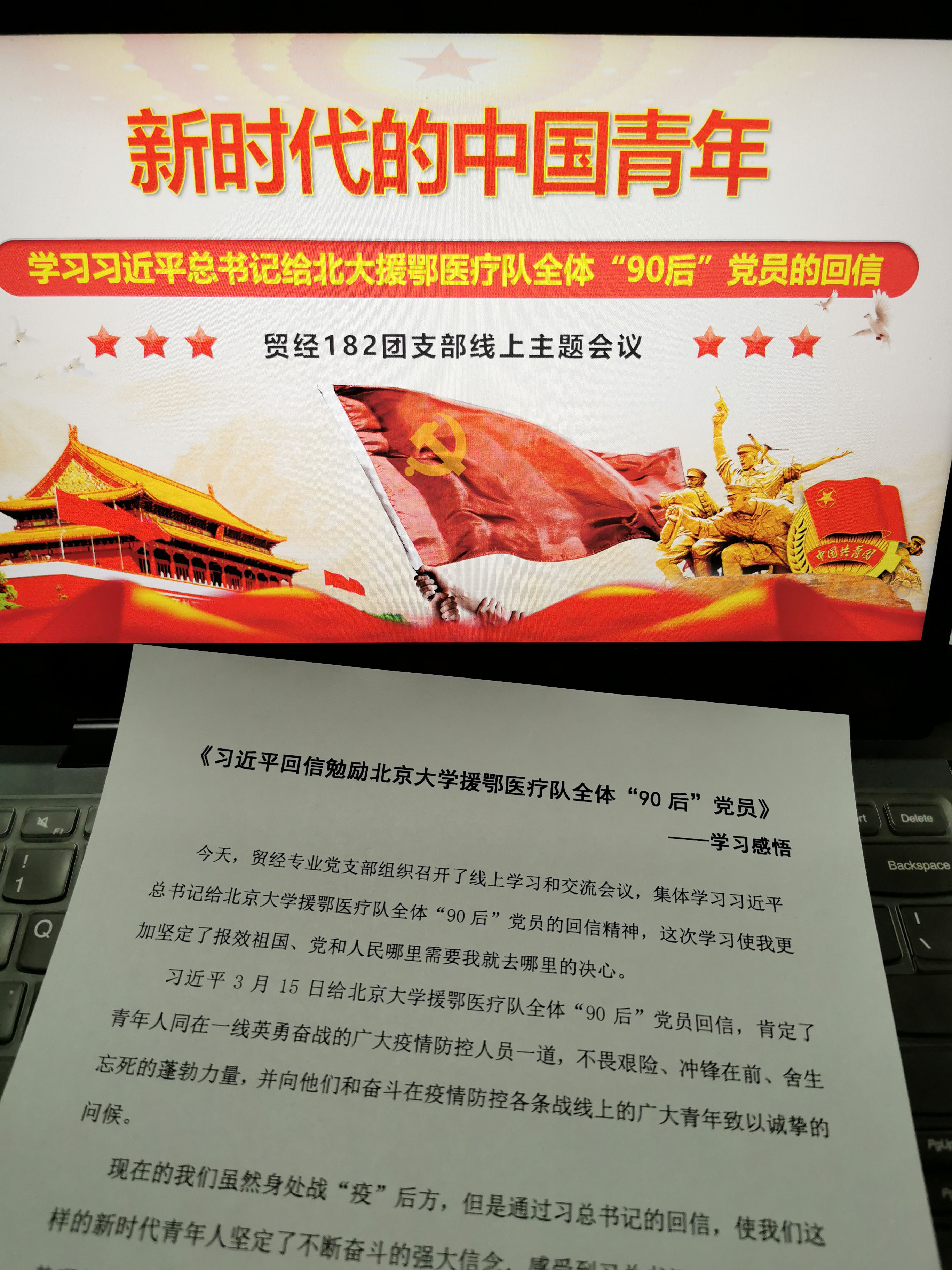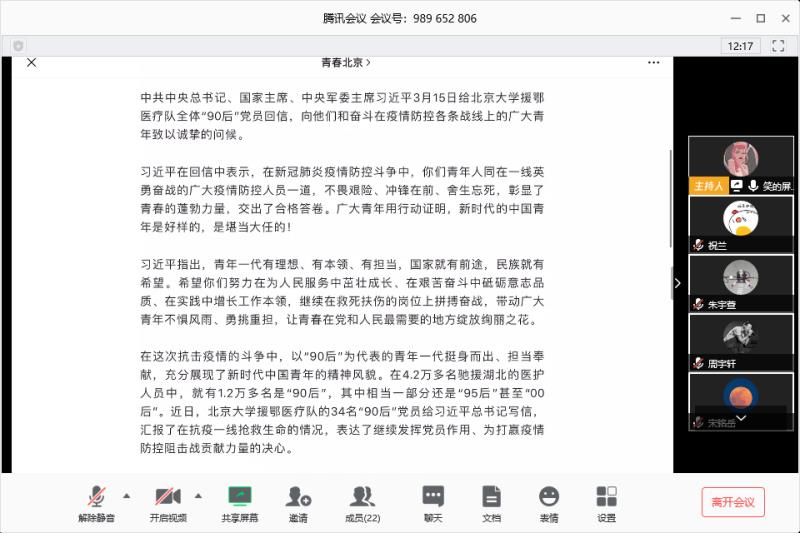 商學院團委組織各班同學通過線上會議討論學習習總書記給北京大學援鄂醫療隊全體“90后”黨員的回信精神。在這次抗擊疫情的斗爭中,以“90后”為代表的青年一代挺身而出、擔當奉獻,充分展現了新時代中國青年的精神風貌。而身為同齡人的我們更應該學習這種精神,成為有理想、有本領、有擔當的青年。因此各班同學在團干部帶領下集體學習了回信內容,深受鼓舞,倍感振奮,紛紛表達了對習近平總書記回信的激動之情,部分團干部結合近期的防疫工作開展情況分享了學習感悟。