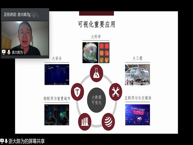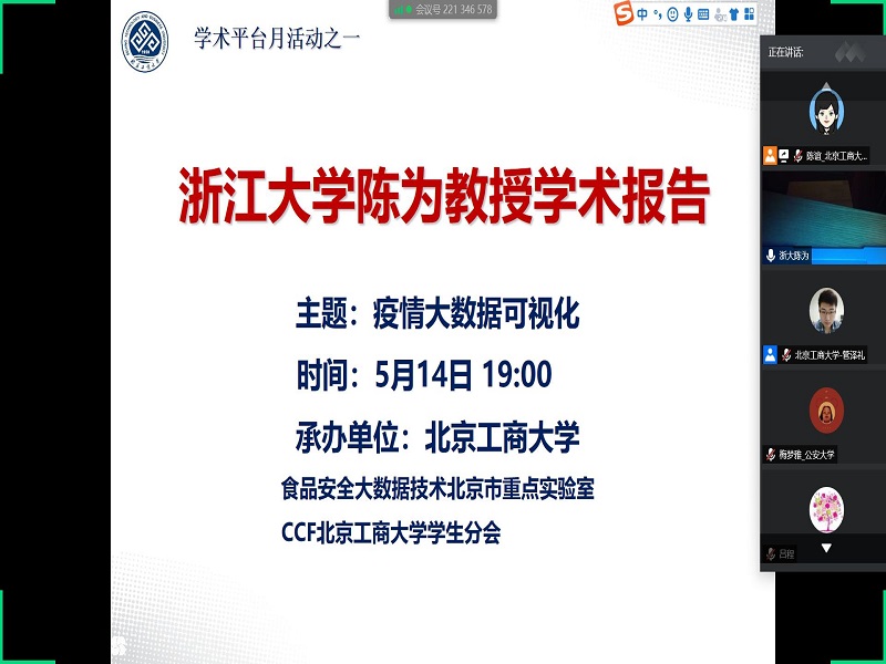 5月14日,重點(diǎn)實(shí)驗(yàn)室2020年科技平臺(tái)月活動(dòng)拉開了序幕。浙江大學(xué)CAD&CG國家重點(diǎn)實(shí)驗(yàn)室副主任陳為教授應(yīng)邀為我校師生做了題為“疫情大數(shù)據(jù)可視化”的學(xué)術(shù)報(bào)告。計(jì)算機(jī)學(xué)院、人工智能學(xué)院、電商與物流學(xué)院、傳媒與設(shè)計(jì)學(xué)院、以及校外多家單位的120余名師生在線聆聽了報(bào)告。報(bào)告會(huì)由食品安全大數(shù)據(jù)技術(shù)北京市重點(diǎn)實(shí)驗(yàn)室主任陳誼教授主持。