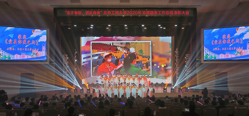 表彰大會分為“青年建功嶄新時代” “青春綻放多彩校園”兩個篇章。大會在視頻《“志于奉獻 愿赴青春”北京工商大學2020年度志愿服務工作紀實》中拉開序幕。