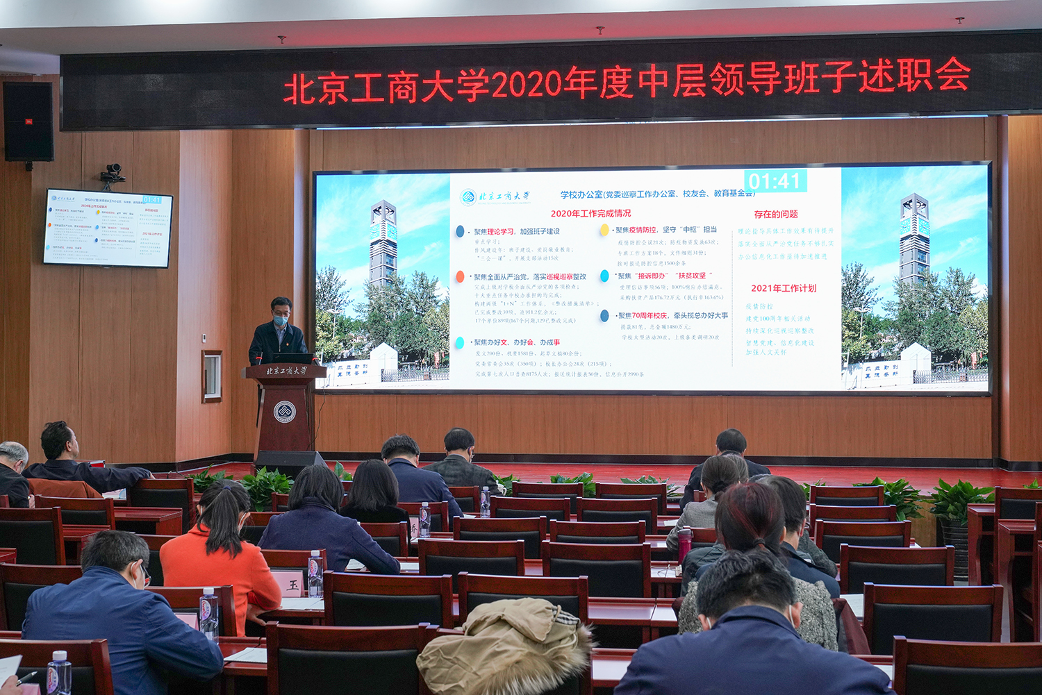 1月12日,學校在阜成路校區召開2020年度中層領導班子述職會。校領導黃先開、孫寶國、張耘、鄭文紅、賈英民出席會議。全體教學單位行政負責人、管理部門負責人和有關代表現場參會。其他中層干部和部分教職工線上參會學習。會議由學校黨委書記黃先開主持。