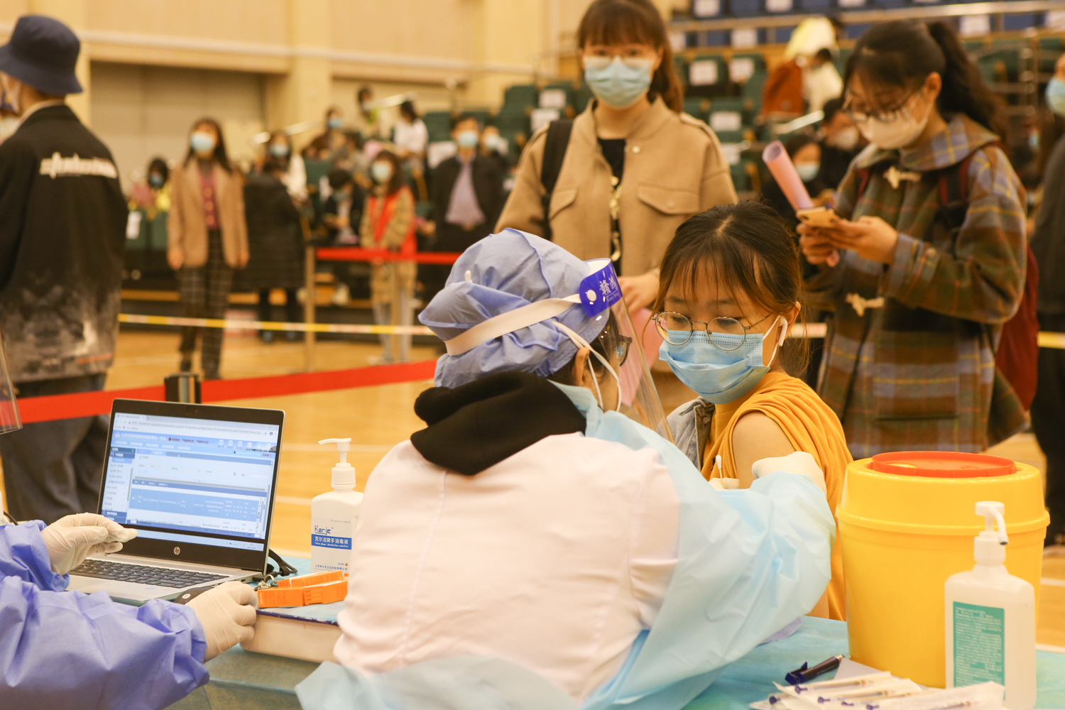早8點,張耘前往疫苗接種現場檢查指導工作,確保接種工作的有序開展。在工作人員的引導下,師生在等待區按照安全距離有序,通過測溫區測試體溫正常后進入場地。到達登記區,醫務人員進行健康狀況詢問,同學們也可進行疫苗接種相關問題咨詢,確認無異常情況可接種疫苗后,填寫知情同意書和留觀提示卡。在接種區,進行身份登記,刷居民身份證錄入信息后進行疫苗接種,并在留觀30分鐘后及時有序離開現場。