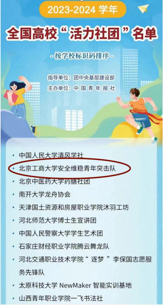 近日,由團中央基層建設部指導、中國青年報社主辦的2023-2024學年全國高校“活力社團”風采展示活動結束,北京工商大學學生社團安全維穩(wěn)青年突擊隊成功入選全國高校“活力社團”榜單,成為北京市獲評的3個高校學生社團之一。