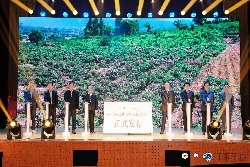 王萬緒理事長、劉瑋教授、董銀卯教授、趙華教授、賈焱教授、周城教授、亓豐偉總經理、張曄翔博士共同按下啟動按鈕,《中國皮膚護理白皮書(2024)》正式發布。