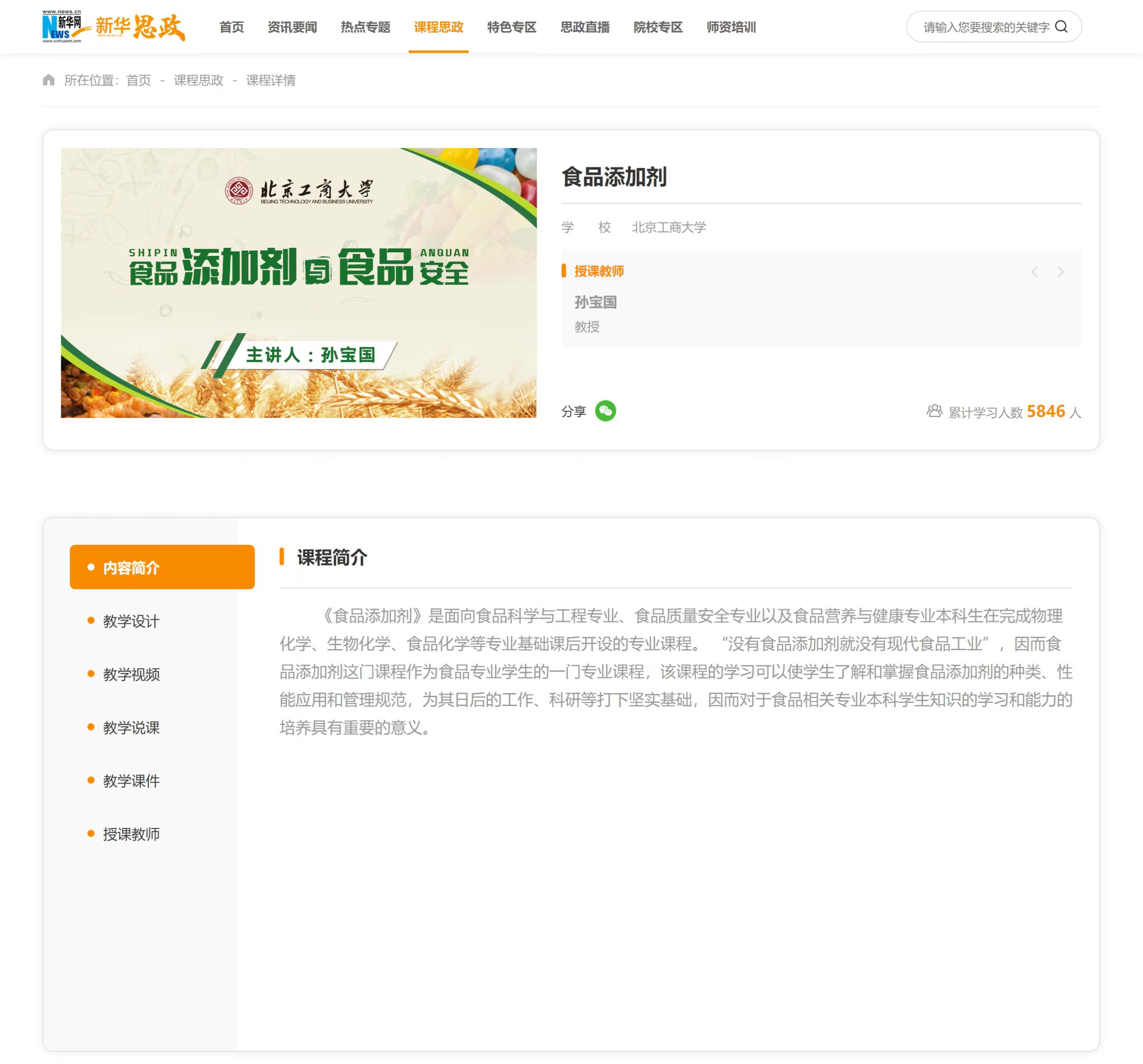 5月16日,從新華網(wǎng)獲悉,我校課程思政優(yōu)秀案例課程《食品添加劑》在“新華思政”-全國(guó)高校課程思政教學(xué)資源服務(wù)平臺(tái)上線,面向全社會(huì)開(kāi)放共享,該課程獲新華課程思政欄目重點(diǎn)推薦。
