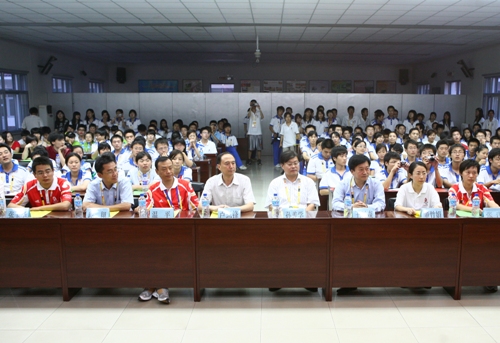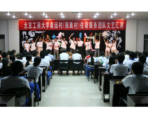 7月25日,是我校奧運村服務生團隊進村“滿月”的紀念日,隊員們舉辦了一場別開生面的文藝晚會,各分隊都準備了豐富多采的文藝節目,表達了服務奧運、奉獻奧運的決心、信心和熱情。學校黨委副書記盧思鋒,奧運村(殘奧村)住宿服務團隊常務副總經理、北京市教委委員孫善學,港中旅集團副總經理、北方區總經理王樹森,奧運村(殘奧村)住宿服務團隊執行副總經理溫平,運動員村執行副總經理段翔,北京高校奧運村(殘奧村)住宿服務團隊辦公室主任張玉華出席晚會并為同學們加油!
