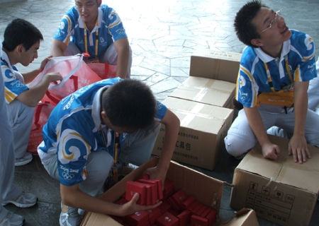 8點30分,我校87名奧運會開閉幕式看臺互動指揮志愿者準時來到國家體育場進行閉幕前的最后準備,領取耳機和大禮包。禮包中的道具是看臺互動指揮志愿者用來帶動觀眾活躍現(xiàn)場氣氛,配合演員演出、運動員入場以及火炬熄滅等重要環(huán)節(jié)的主要工具。