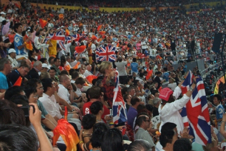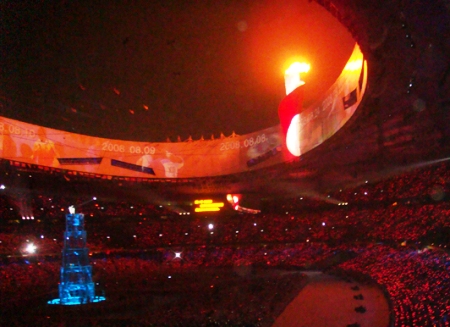 20點,奧運會閉幕式正式開始,看臺互動指揮志愿者的表演時刻到來,此時的國家體育場歌聲飛揚、笑語不斷,洋溢著熱烈喜慶的氣氛?;又笓]志愿者認真的執(zhí)行著總指揮的命令,一刻不敢怠慢。他們面帶微笑、顫動性的語言、夸張的動作,吸引了觀眾們的目光,場上高潮迭起,飄逸的祥云紗在場內飛舞,繽紛的彩紙漫天飛揚,歌聲、笑聲、歡呼聲響徹云宵,國家體育場成了歡樂的海洋。“今晚奧林匹克的圣火不會熄滅”,奧運圣火繼續(xù)在每一個人心中燃燒。