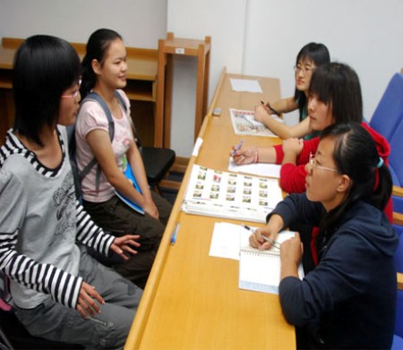 在面試現(xiàn)場(chǎng),同學(xué)們被分成兩組有序面試。校學(xué)生記者團(tuán)的老團(tuán)員與前來(lái)面試的新生進(jìn)行了面對(duì)面的交流。學(xué)長(zhǎng)學(xué)姐們向他們提出了很多問(wèn)題,比如“簡(jiǎn)單介紹一下自己的愛(ài)好?”“以前做過(guò)有關(guān)心新聞方面的工作嗎?”“經(jīng)常讀什么報(bào)紙嗎?”“會(huì)使用那些電視制作軟件?”等。校學(xué)生記者團(tuán)還拿出了校報(bào)及許多照片讓同學(xué)們欣賞評(píng)析。參加面試新生的自信和熱情都洋溢在了臉上,現(xiàn)場(chǎng)氣氛輕松愉快。