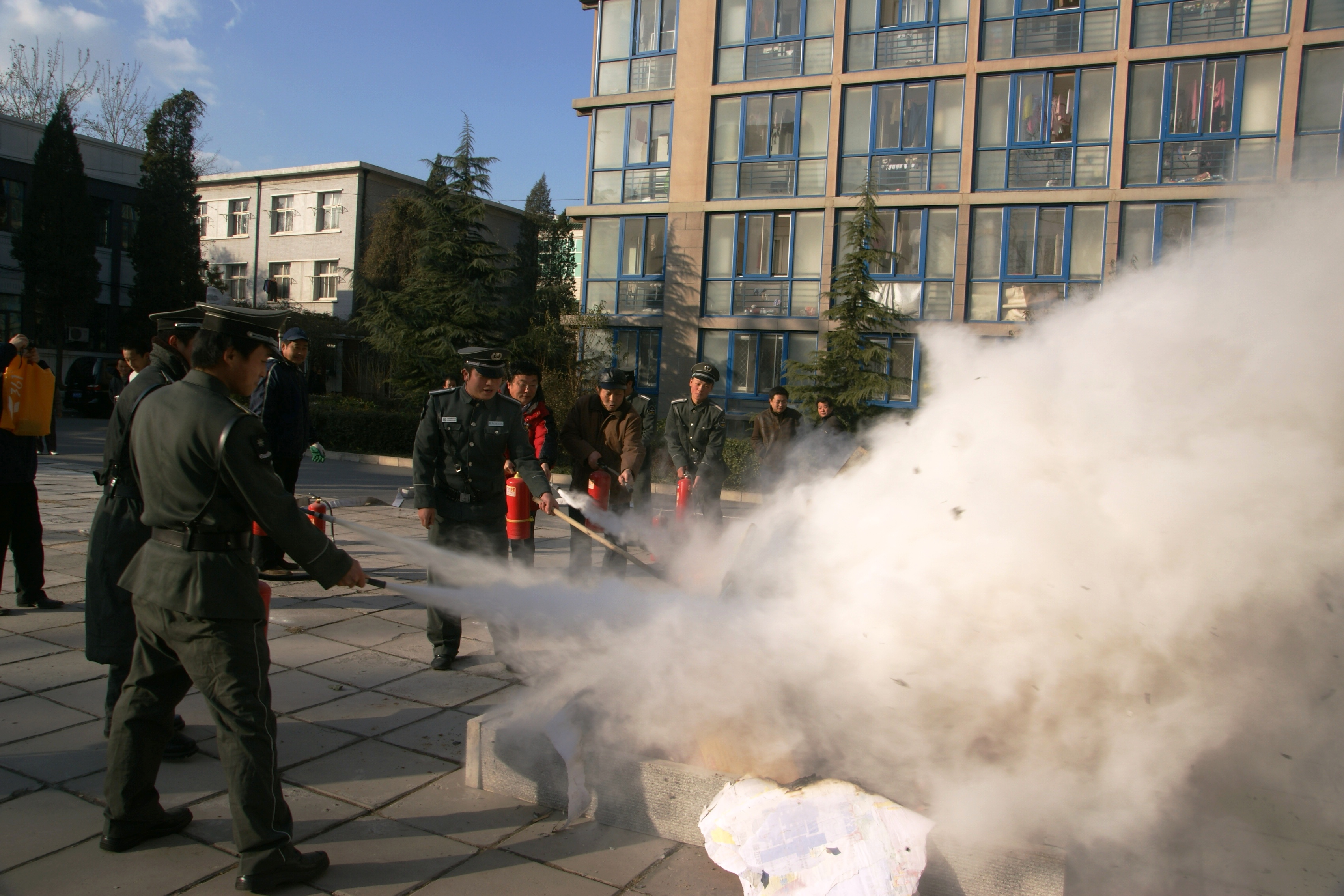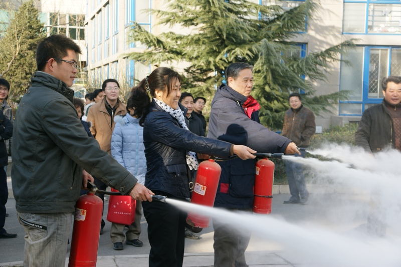 會后在東區(qū)學(xué)生公寓前,頓處長示范了干粉滅火器的使用方法,全體參訓(xùn)教工很有興趣地進行了演練,掌握了滅火器的使用方法。接著在場保安又進行了水用消防栓、消防帶的使用演習(xí)。