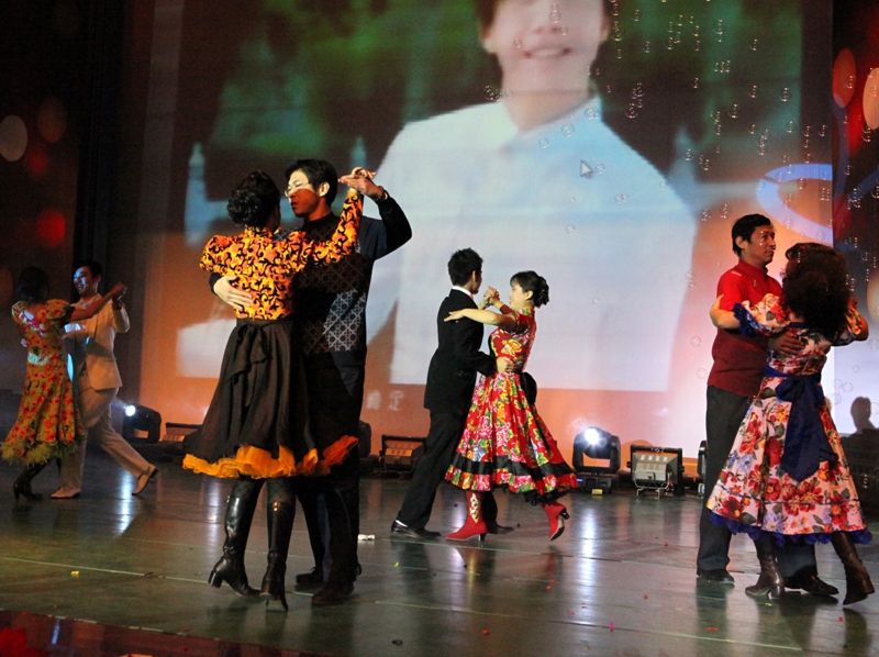 交誼舞、街舞、斗舞、現代舞;民族歌、流行歌……豐富多彩的節目掀起一個又一個高潮。通過交誼舞社簡單的示范后,在場觀眾兩人一組進入舞池,伴隨著悠揚的樂曲翩翩起舞。最后的多人現代舞帶動起全場的高潮,還在座位上的觀眾按捺不住激情紛紛進入舞池與舞者一同跳舞。盧思鋒副書記與眾多老師再次進入舞池,隨著歡快的節奏將華爾茲優美的韻律再次展現給大家。最后,現場的所有觀眾及工作人員伴隨著兔子舞的音樂在舞池內圍成一個多層的大圈,歡快的跳動著。