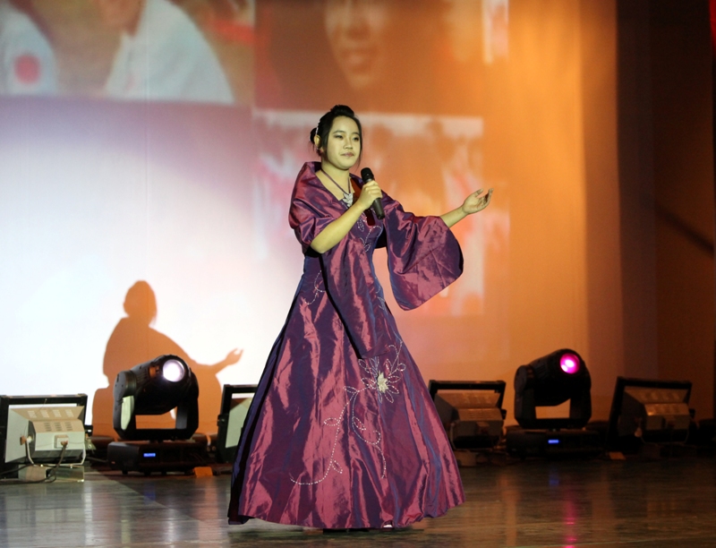 雖然只是在電視機前看過慶祝盛典,剛剛步入大學校門的09級新生擁有著同樣的愛國熱情。一曲動人的《我愛你,中國》唱出了對祖國母親的思戀與祝福。演唱者財務091的吳迪用高亢嘹亮的歌喉將歌曲的優美展現地淋漓盡致,她將歌曲的音調和觀眾的情緒同時帶向了高潮。