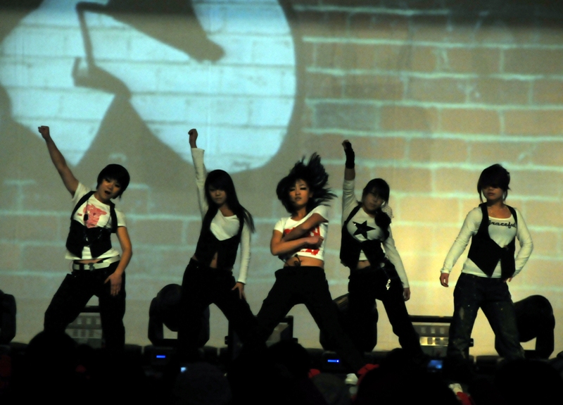 節奏強烈的音樂中,各種炫目的燈光下,來自街舞社、校舞蹈團的十幾名舞蹈演員齊聚一堂,大秀舞技,盡情扭動,無限伸展,為全場帶來勁爆的街舞表演。舞臺上他們充分展示街舞的魅力,舞臺下觀眾的歡呼吶喊聲一浪高過一浪,掀起全場一個又一個高潮。