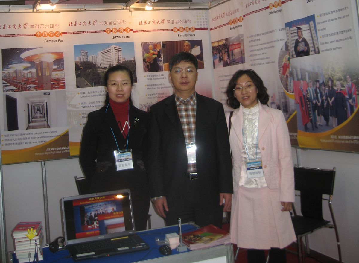我校國際處全體同志在處領導的帶領下,齊心協力為此次韓國參展做了大量的準備工作,精心設計制作了“北京工商大學留學指南”手冊、展板、北京工商大學圖標及現場宣傳演示的PPT課件等。在韓國參展期間,我校富有特色的展位布置和極具親和力的宣傳冊及紀念品吸引了大量的來賓前來咨詢,洽談,并有不少有意向的人員留下了聯系方式。我國駐韓國教育參贊艾宏歌也來到我校展位前視察,詢問有關情況并與我校工作人員合影留念。