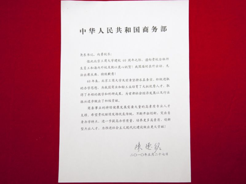 值此北京工商大學建校60周年之際,謹向貴校全體師生員工和海內(nèi)外校友致以衷心祝賀!我因?qū)脮r在外出訪,無法出席慶典,特致歉意!