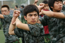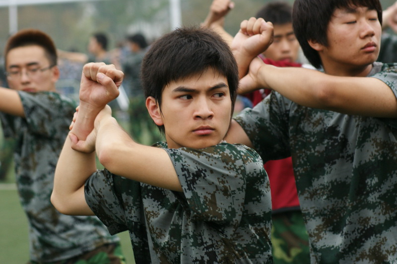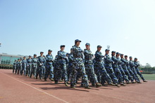七點(diǎn)半到十點(diǎn)半是隊(duì)列訓(xùn)練——停止間轉(zhuǎn)法、齊步進(jìn)行及立定(腿部動(dòng)作練習(xí))齊步進(jìn)行及立定、跑步進(jìn)行及立定。雖然并沒(méi)有太大的運(yùn)動(dòng)量,但是很多同學(xué)的后背還是已經(jīng)全部濕透了;還有的同學(xué)的額前的劉海已經(jīng)由蓬松的碎發(fā)變成了一縷一縷的了。在整整3個(gè)小時(shí)的訓(xùn)練當(dāng)中,并沒(méi)有許多休息的時(shí)間,但是同學(xué)中并沒(méi)有人發(fā)出抱怨,取而代之的是,“1、2、3、4”的口號(hào)聲和打拳的呼號(hào)聲。