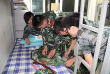 “檢查的來(lái)啦!”回聲傳遍了整個(gè)樓道。剛才還在嬉笑打鬧的同學(xué)們立刻安靜了下來(lái)。雖然剛剛結(jié)束訓(xùn)練,但是沒(méi)有人躺在床上,同學(xué)們有的站著,有的坐在桌子上,還有的夸張點(diǎn)的,躺在桌子上。同學(xué)都說(shuō)“就等這一刻了,別把床單弄皺了!”伴隨著檢查老師的每一聲點(diǎn)評(píng),同學(xué)們是有人歡喜有人憂。“宿舍就沒(méi)這么干凈過(guò)!”很多同學(xué)都在檢查后和宿舍合了影。“打掃了一晚上,還真有點(diǎn)軍隊(duì)宿舍的意思了!”