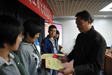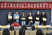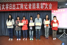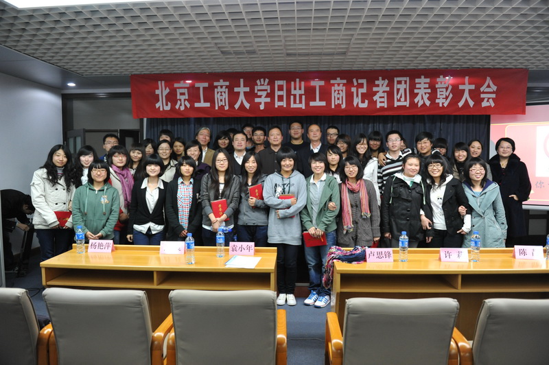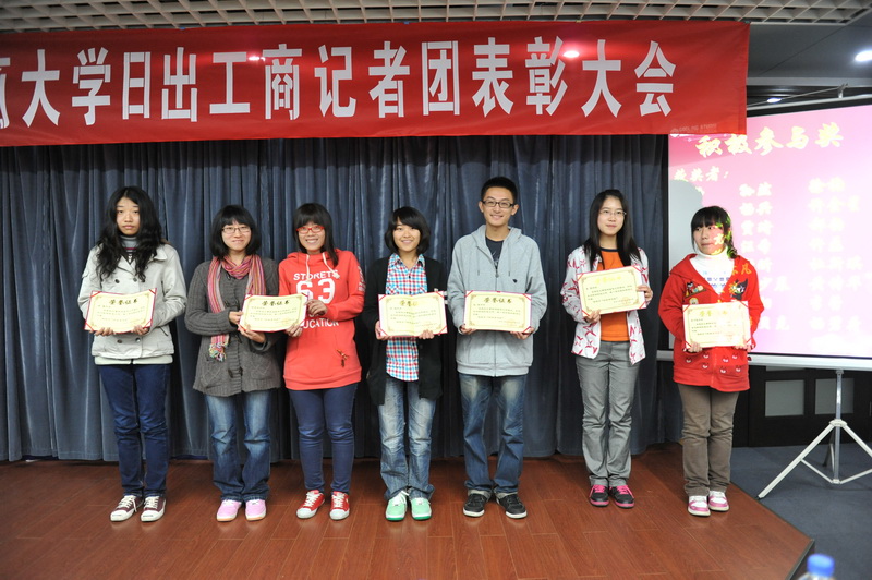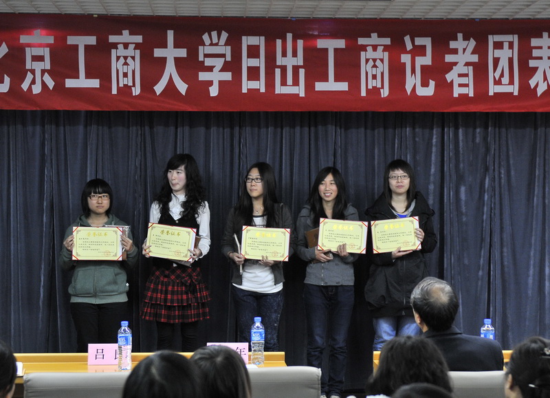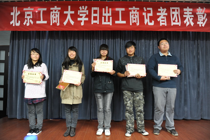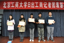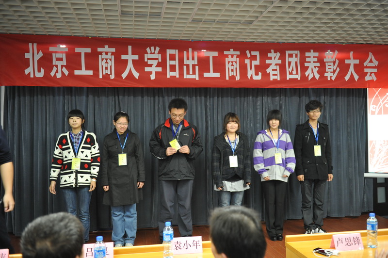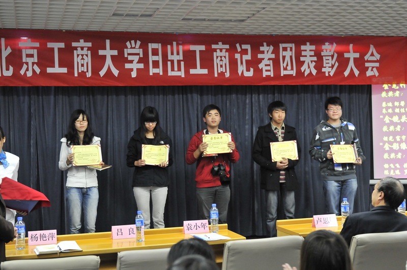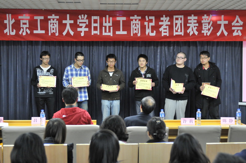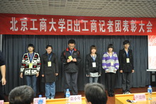 黨委宣傳部副部長(zhǎng)袁小年宣讀《關(guān)于表彰日出工商記者團(tuán)優(yōu)秀學(xué)生記者的決定》。日出工商記者團(tuán)是北京工商大學(xué)一支優(yōu)秀的學(xué)生社團(tuán)。幾年來(lái),在黨委宣傳部的領(lǐng)導(dǎo)下,日出工商記者團(tuán)已迅速成長(zhǎng)為校園生活的記錄者,學(xué)校改革的宣傳者,社會(huì)主義價(jià)值觀的捍衛(wèi)者。特別是在我校60周年校慶、2009、2010級(jí)學(xué)生軍訓(xùn)新聞報(bào)道中,學(xué)生記者以文字、圖片、視頻、廣播等多種形式全方位、多視角、立體化地展示了活動(dòng)盛況,展現(xiàn)了我校師生良好的精神風(fēng)貌,同時(shí),也展現(xiàn)出了日出工商記者團(tuán)積極向上的奉獻(xiàn)精神,展現(xiàn)出了日出工商記者團(tuán)訓(xùn)練有素的業(yè)務(wù)素養(yǎng),展現(xiàn)出了日出工商記者團(tuán)后繼有人的蓬勃態(tài)勢(shì)。為繼承日出工商記者團(tuán)光榮歷史,激勵(lì)新一屆日出工商記者團(tuán)成員再創(chuàng)輝煌,特對(duì)日出工商記者團(tuán)表現(xiàn)優(yōu)秀的學(xué)生記者進(jìn)行表彰。授予13名資深記者“突出貢獻(xiàn)獎(jiǎng)”、15名優(yōu)秀文字記者“金筆桿”獎(jiǎng)、3名優(yōu)秀攝影記者“金鏡頭”獎(jiǎng)、13名優(yōu)秀攝像記者“金影像”獎(jiǎng)、38人“積極參與獎(jiǎng)”(名單見(jiàn)附件)。在歡快的樂(lè)曲聲中,獲獎(jiǎng)學(xué)生記者依次臺(tái)上,從領(lǐng)導(dǎo)手中接過(guò)金燦燦的榮譽(yù)證書(shū)和獎(jiǎng)品。相機(jī)咔咔聲不斷,現(xiàn)場(chǎng)氣氛越發(fā)熱烈。