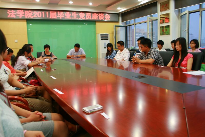 6月15日晚,法學(xué)院在阜成路校區(qū)召開了2011屆畢業(yè)生黨員座談會。學(xué)院全體畢業(yè)生黨員參加了座談會,副院長謝安平出席了座談會,會議由黨總支副書記文四英主持。