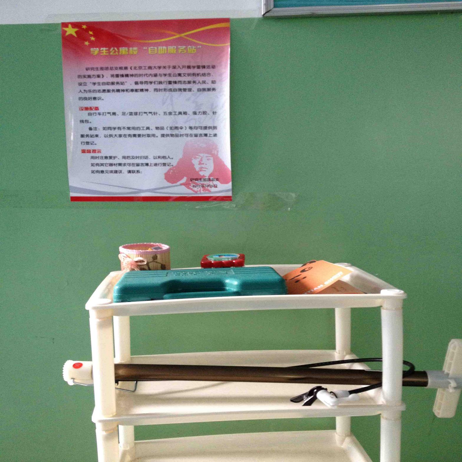 為配合學校公寓文明建設,滿足廣大研究生同學基本生活需求,研究生部團總支、研究生會在阜成路東區雙子樓、四號公寓樓入口處設置了“學生自助服務站”。并將宣傳學習雷鋒精神與公寓文明建設有機結合,通過提供“簡易便利工具借用”的方式,倡導同學們踐行雷鋒同志助人為樂、奉獻服務的精神,促進研究生“自我管理、自我服務、自我監督”良好意識的形成。