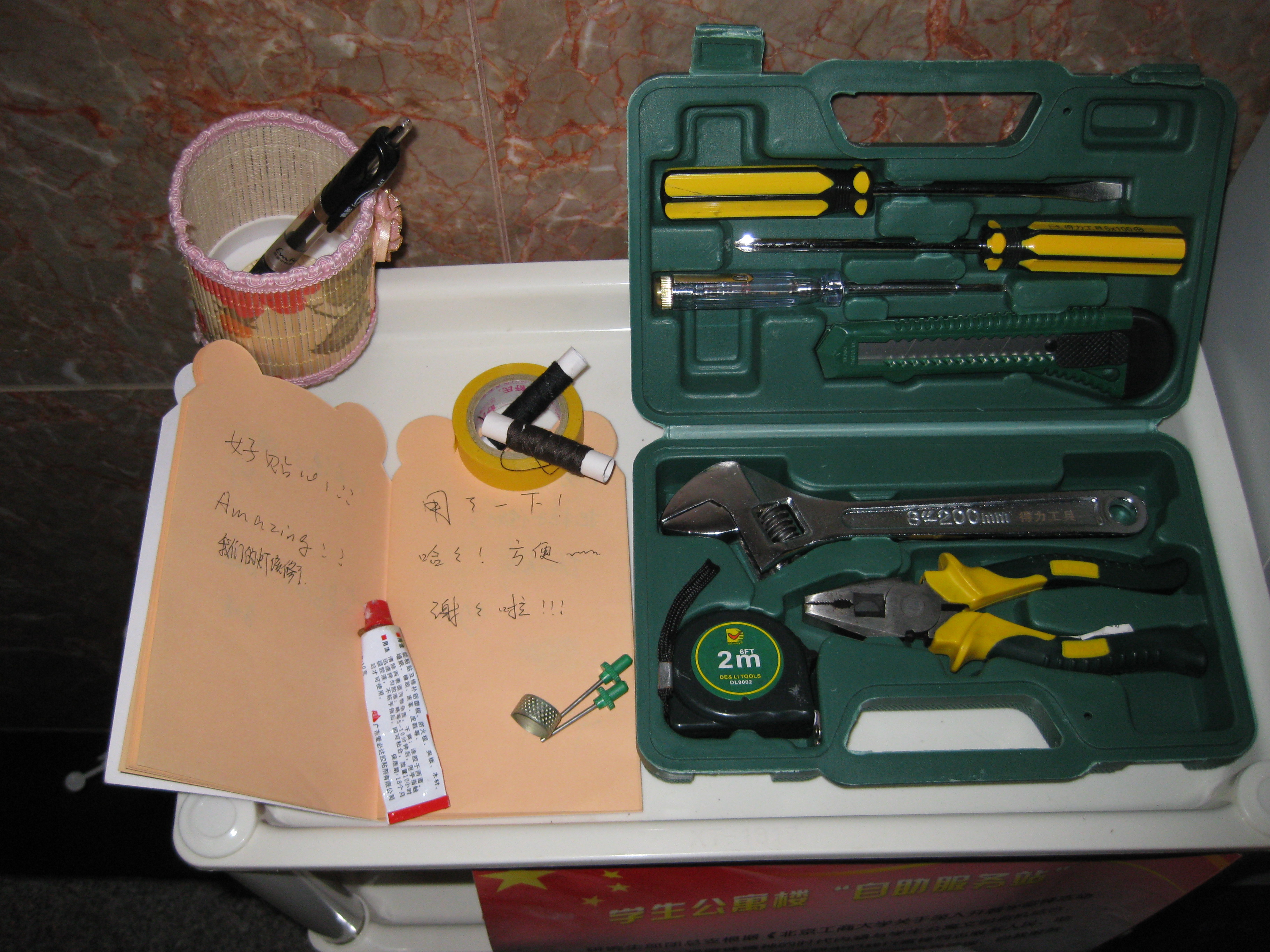 在廣泛征求意見后,服務站為同學們統一配備了自行車打氣筒、足/籃球打氣氣針、五金工具箱、強力膠、針線包等常用工具,并倡導同學們發揚雷鋒精神,將自己不常用的工具、物品提供到服務站來,以供他人在有需要時取用。此外,服務站還設有留言簿和意見箱,同學們可將有需求的器材或可提供的物品進行登記,還可通過意見箱及時反饋意見和建議。