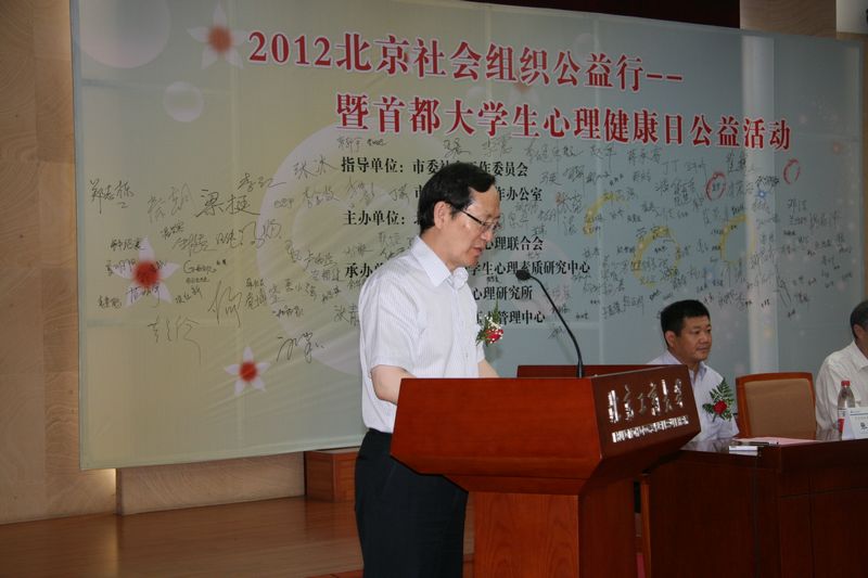 今年,在首都第十三個“5.25”大學生心理健康日到來之際,市委副秘書長王翔、市委社會工委副書記,市社會辦副主任張堅、市委社會工委委員,市社會辦副主任劉軒、市社會辦副巡視員張青之等領導蒞臨我校,在校長譚向勇和黨委副書記盧思鋒的陪同下,來到大學生中間,參加由我校和北京市社會心理聯合會主辦的“2012北京社會組織公益行暨首都大學生心理健康日公益活動”。活動啟動儀式由學校黨委副書記盧思鋒主持。