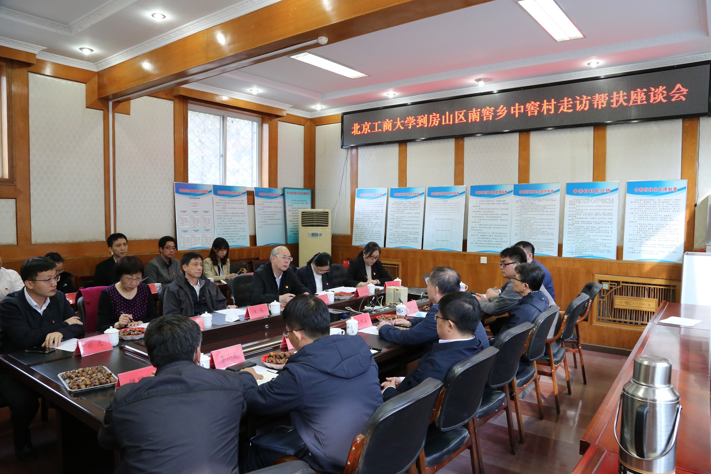 王化占帶隊歡迎王偉一行,雙方進行了親切友好的座談交流。在觀看南窖鄉宣傳片之后,中窖村黨支部書記趙樹宏介紹了該村情況。王一匯報了駐村以來開展黨建引領、農村治理、經濟發展、解憂紓困、為民服務等幫扶工作情況。他表示,在接下來工作中,將繼續發揚好北工商精神和作風,探索發揮高校服務社會功能新路徑,實現學校與鄉、村的合作共建和發展共贏。