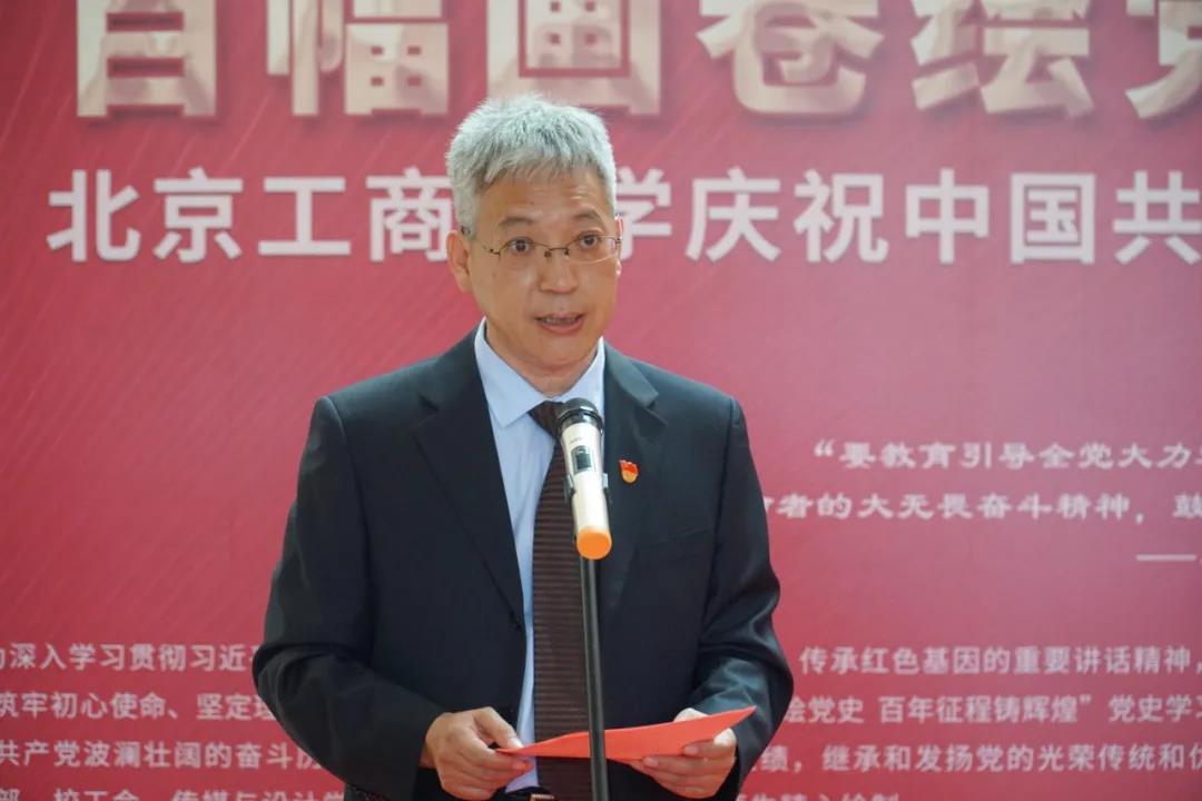 黃先開代表學校黨委,向出席開展儀式的各位老師、同志們表示熱烈的歡迎,向為此次主題展覽成功舉辦付出辛勤努力的相關單位和精心創作作品的師生們表示衷心的感謝!他指出,為深入學習貫徹習近平總書記關于學習黨史,發揚紅色傳統、傳承紅色基因的重要講話精神,深入開展黨史學習教育,筑牢初心使命、堅定理想信念,學校舉辦“百幅畫卷繪黨史 百年征程鑄輝煌”黨史學習教育主題展覽。此次主題展覽是學校慶祝建黨百年的重要內容之一,是學校黨史學習教育的生動教材。北工商師生發揮專業所長積極踴躍創作,將藝術表達融入黨史學習教育,將課程思政與黨史學習教育緊密結合,進行了一次黨史學習教育的生動實踐。