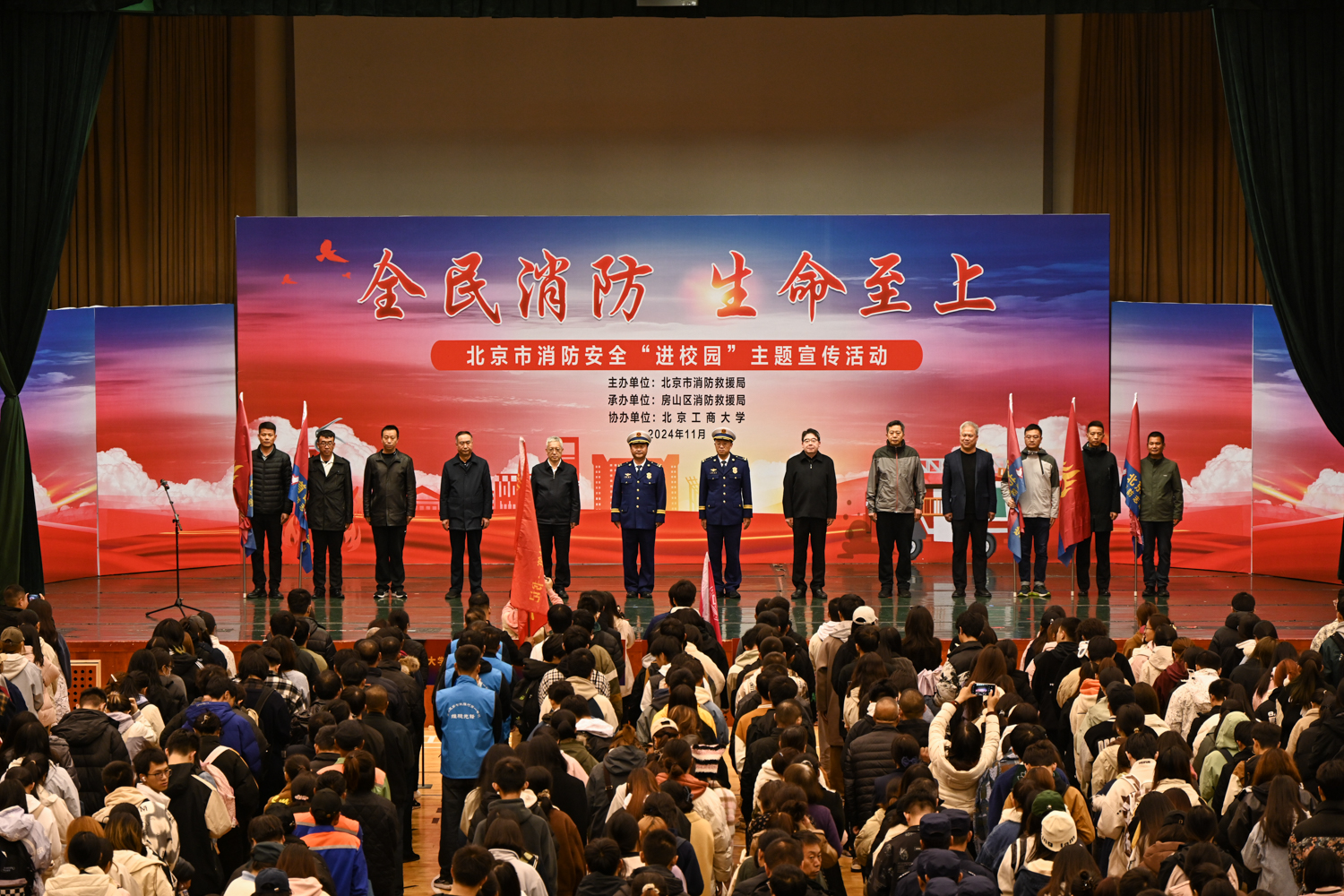 11月13日下午,北京市消防救援局在學(xué)校良鄉(xiāng)主校區(qū)文體館舉辦消防宣傳“進(jìn)校園”暨消防宣傳月系列活動(dòng)。此次活動(dòng)以“全民消防,生命至上”為主題,旨在提高師生消防安全意識(shí),增強(qiáng)校園火災(zāi)防控能力。學(xué)校黨委副書記李中奇出席活動(dòng),市消防救援局、房山區(qū)消防救援局、良鄉(xiāng)大學(xué)城管委會(huì)、北京工商大學(xué)、北京中醫(yī)藥大學(xué)、北京理工大學(xué)、首都師范大學(xué)和中國(guó)社會(huì)科學(xué)院大學(xué)、北京消防志愿服務(wù)總隊(duì)志愿者代表、房山區(qū)各消防志愿服務(wù)隊(duì)志愿者代表、高校學(xué)生代表和社會(huì)各界及群眾代表約1000人參加了活動(dòng)。