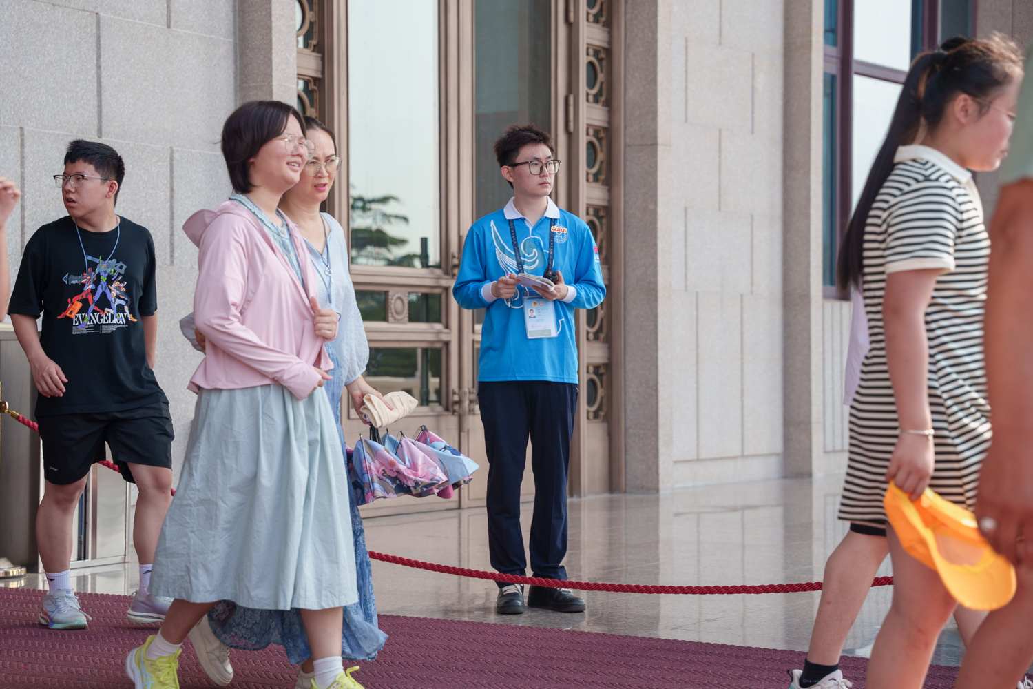 在紀念堂的北側流淌著一條由瞻仰群眾匯成的“思念的河”,他們懷著崇敬之心從各地奔赴而來。烈日酷暑下,志愿者們皮膚曬得通紅,嗓音變得沙啞,卻始終以最挺拔的身姿、最溫暖的笑容耐心解答、有序引導。志愿者許庭歡深有感觸地表示:“在上崗的每一天里,汗水很快便浸濕了后背,但當看到一位位瞻仰群眾懷揣著對偉大領袖毛主席的敬仰與緬懷之情,并順利進入紀念堂之時,瞬間便驅散了疲憊。”