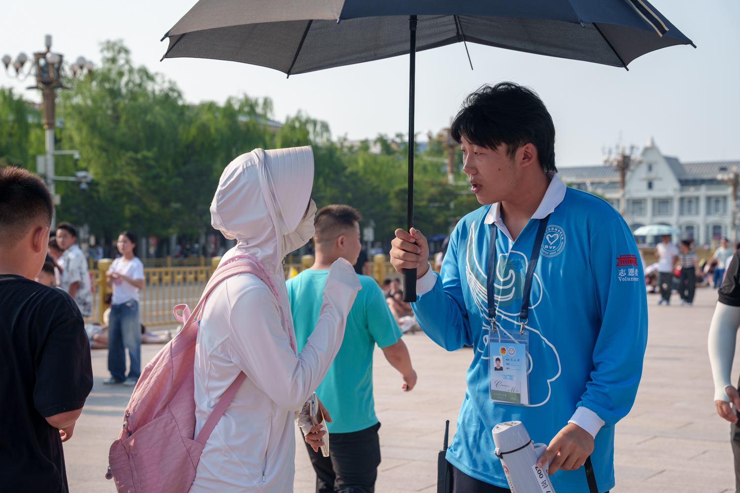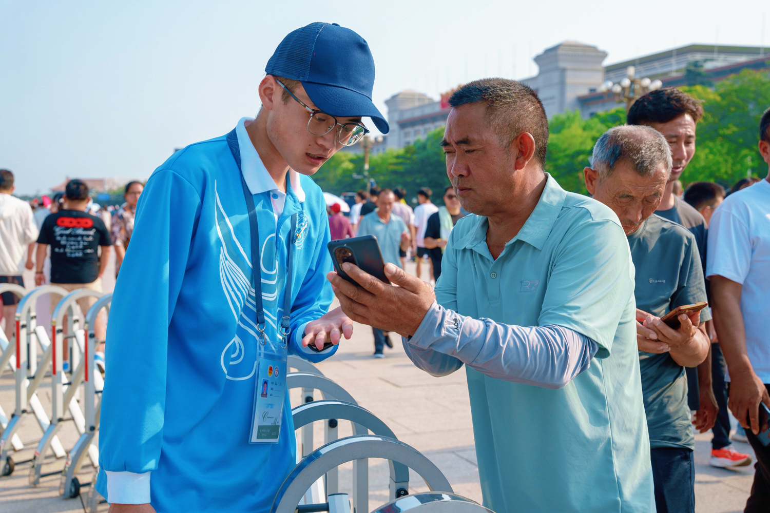 每日凌晨5點,志愿者們迎著旭日整裝集結,7點前準時奔赴扶老助殘、預約指導、解疑答惑、秩序維護、獻花引導等14個不同的服務崗位。在烈日炎炎的八月盛夏,室外高溫炙烤,志愿者們的衣服雖被汗水浸透,但他們在各自的崗位上始終如一,為來自五湖四海的瞻仰群眾提供暖心、細致、周到的服務:一絲不茍地維護現場秩序,認真細致地解答群眾疑問,悉心攙扶步履蹣跚的老人,全力協助殘障人士上下輪椅……成為天安門廣場上一道亮麗的風景線,也生動展現了新時代首都志愿者的良好風貌。