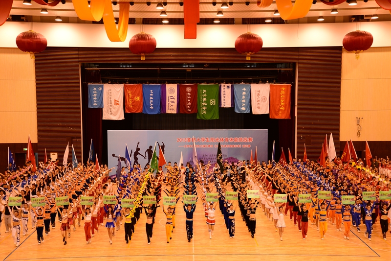 11月10日, 2013年首都大學(xué)生陽(yáng)光體育體能挑戰(zhàn)賽在我校良鄉(xiāng)文體館舉行,來自32所高校的36支隊(duì)伍參加了甲、乙、丙組的角逐。活動(dòng)由北京市教委主辦,北京市大學(xué)生體育協(xié)會(huì)和我校共同承辦。北京市大學(xué)生體育協(xié)會(huì)主席杜松彭、我校黨委副書記張德玉出席活動(dòng)并講話。北京市教委體衛(wèi)藝處處長(zhǎng)王東江,北京市大體協(xié)競(jìng)賽部主任、北京大學(xué)郝光安教授,國(guó)際體操聯(lián)合會(huì)健美操技術(shù)委員會(huì)王宏副主任出席活動(dòng)并頒獎(jiǎng)。
