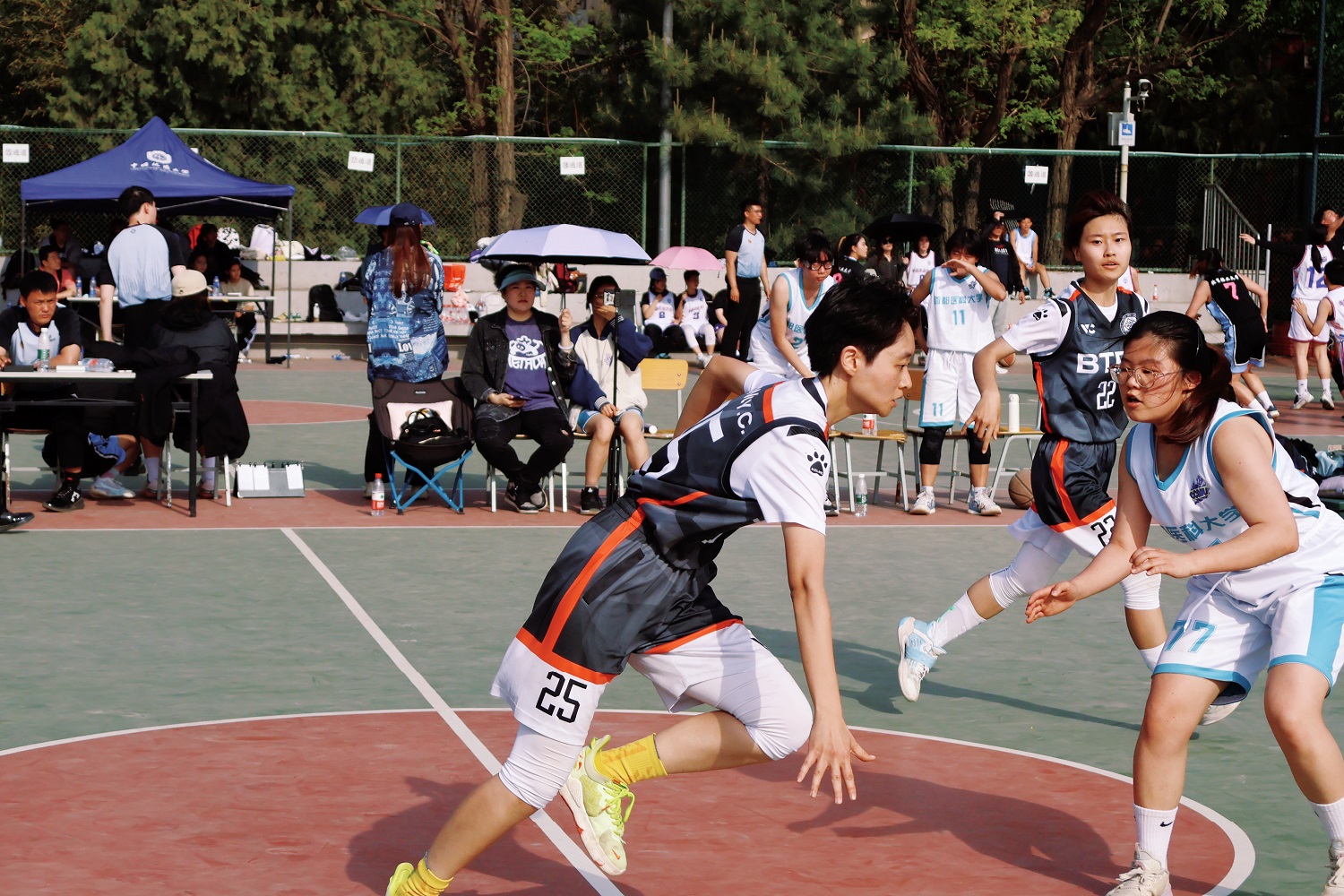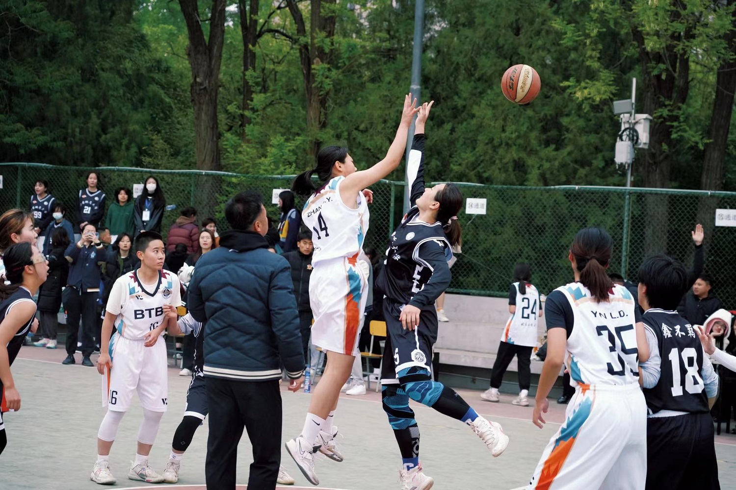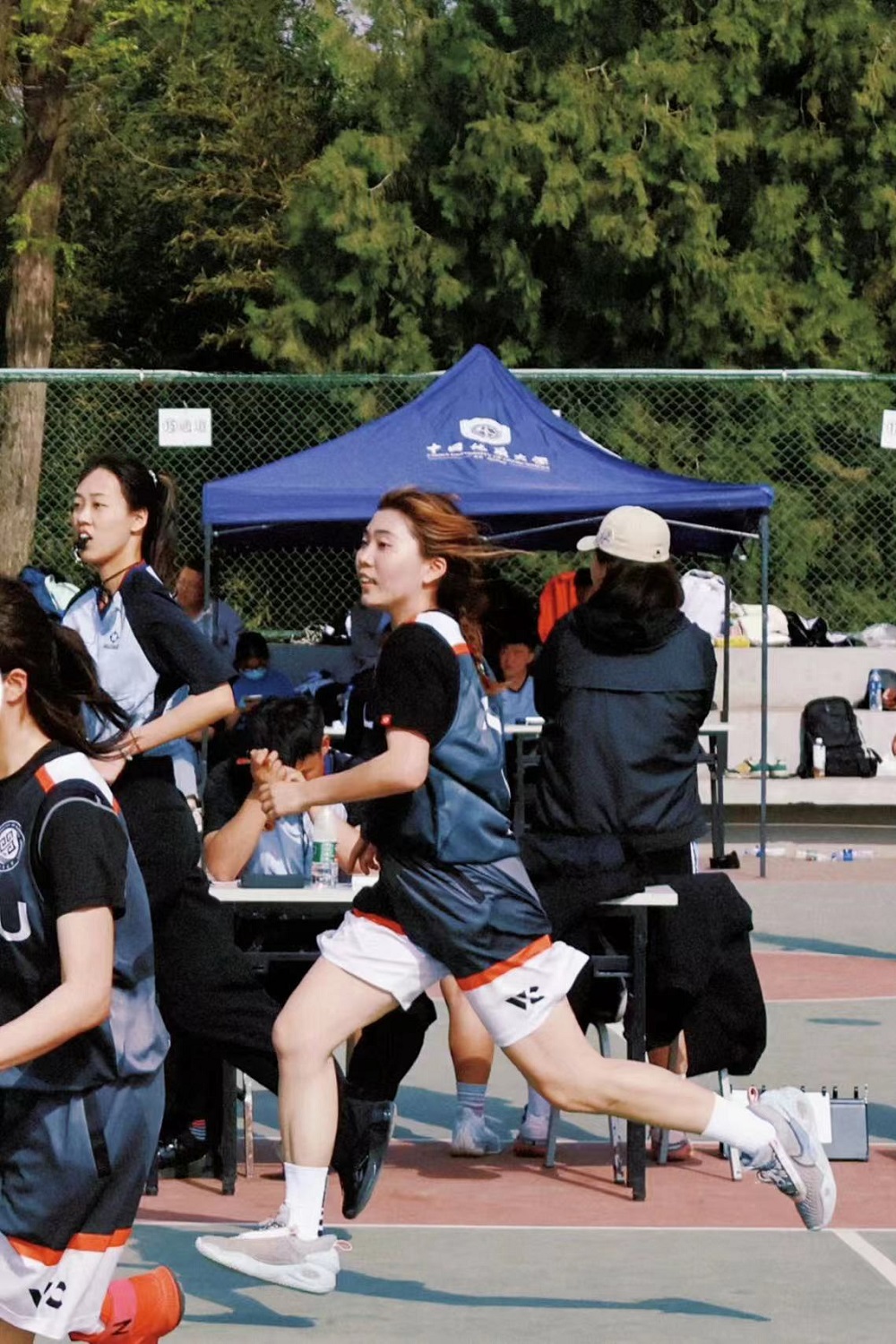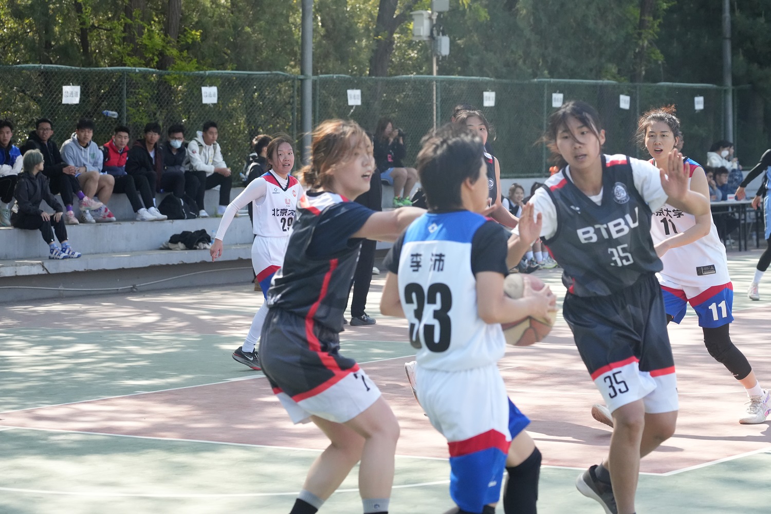 賽事一開局就進入膠著狀態,在僵持中,我方35號殷路得率先出手打板命中,為北工商打進第一球!隨后北工商勢如破竹,第一節以12比10領先2分結束。第二節伊始,35號殷路得、10號李彤持續突破籃下,將比分差距迅速擴大至21比15,領先6分。半場回來,對方不斷調整戰術,持續突破籃下挑籃得分,追平得分后反超我校2分。在焦灼比賽中,我方首發7號李澤葦在爭搶籃板球時崴腳受傷,我校教練立刻叫了暫停,穩定隊員情緒,重新布置戰術,用13號王靖淳替換上場,并接連拿下關鍵籃板球。在比賽關鍵時刻,我隊14號張思穎接連送出兩記利落的蓋帽,并與進攻中接到23號后衛馬思佳半場傳導球后突破籃下,造成對方犯規,兩罰中一,北工商姑娘們士氣大漲,尤其在35號殷路得進攻只剩5秒時關鍵三分命中,激起所有隊員高亢的情緒,吹響了進攻的號角。姑娘們越戰越勇,接連得分,一路高歌猛進,場上節奏完全被我隊掌控,最終以7分的優勢奪得冠軍!