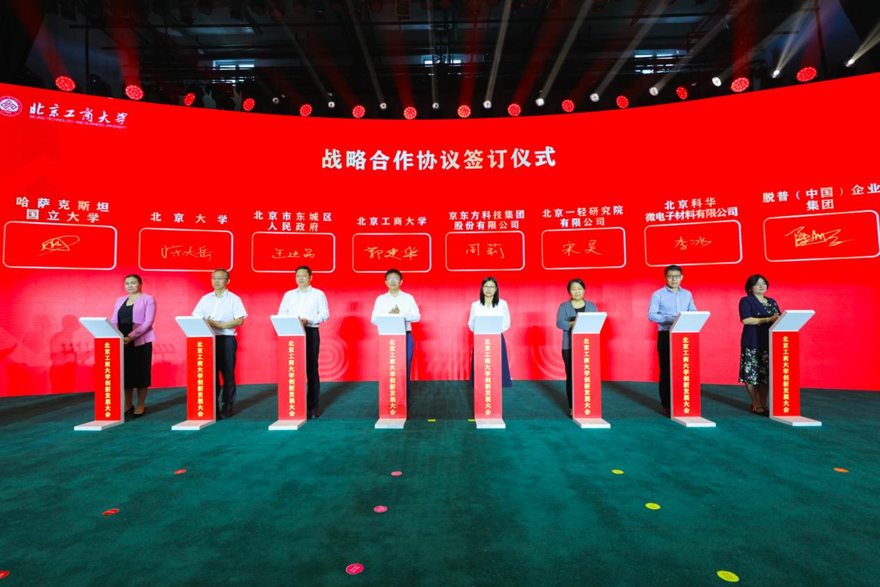 為進一步拓寬產教融合與協同創新發展路徑,北京工商大學與哈薩克斯坦國立大學、北京大學、北京市東城區人民政府、京東方科技集團股份有限公司、北京一輕研究院有限公司、北京科華微電子材料有限公司、脫普(中國)企業集團等多領域代表,分別簽署戰略合作框架協議,攜手譜寫新時代高等教育事業與經濟社會發展的嶄新篇章。