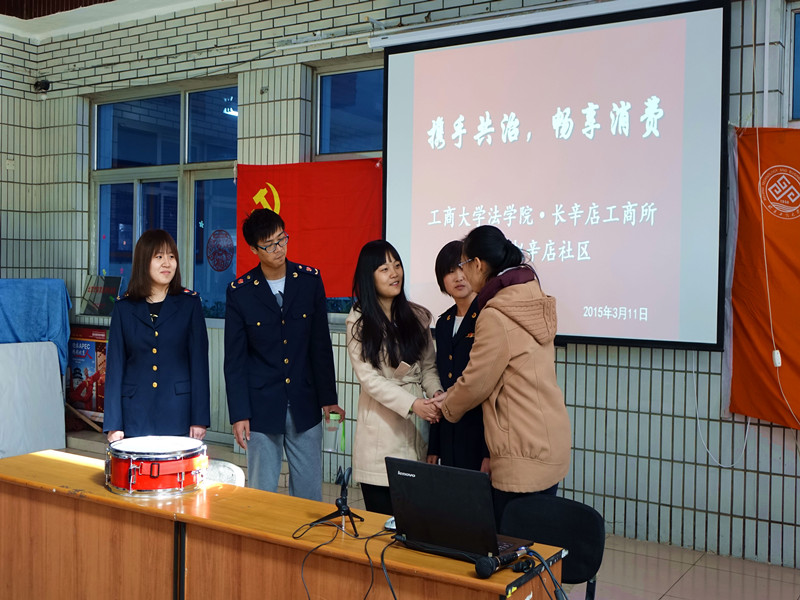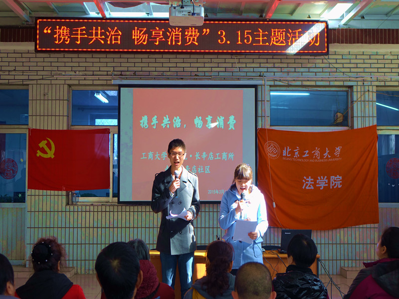 同時,法學(xué)院學(xué)生黨支部與青年志愿者協(xié)會攜手北京市豐臺區(qū)長辛店工商所前往豐臺區(qū)趙辛店社區(qū),開展了以“攜手共治,暢享消費(fèi)”為主題的3·15普法宣傳活動。同學(xué)們發(fā)揮法學(xué)專業(yè)知識,通過自編自演的小品、三句半等普及法律知識,鼓勵消費(fèi)者保護(hù)自身合法權(quán)益。活動中還穿插有獎競答環(huán)節(jié),主持人對社區(qū)群眾提出關(guān)于社會生活中較常見的問題,由同學(xué)們?yōu)閾尨鹫_者發(fā)放不同形式的小獎品。活動結(jié)束后,同學(xué)們還為大家發(fā)放了宣傳冊,接受現(xiàn)場答疑。活動深受社區(qū)公民好評,收到了良好的社會效果。