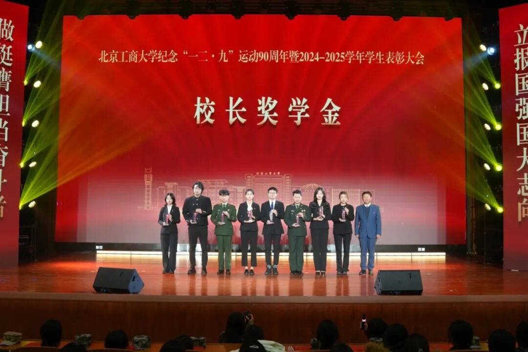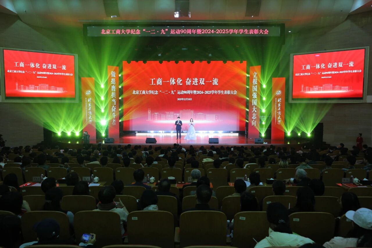 12月10日,北京工商大學紀念“一二·九”運動90周年暨2024-2025學年優秀學生表彰大會在良鄉主校區舉行。校領導沈千帆、郭建華、李中奇、宋曉欣、楊紅、徐丹丹、鄧祥征出席大會,相關職能部門負責人、各學院黨政領導、校友獎學金代表、校友代表、教師代表、獲獎學生代表參加大會。大會榮幸邀請到了當年曾參與和組織“一二·九”運動的黃華、陸平兩位革命先輩的后代:黃玫女士與陸瑩女士,與全場師生一起見證傳承歷史偉績,表彰青春榜樣,激昂奮斗力量。