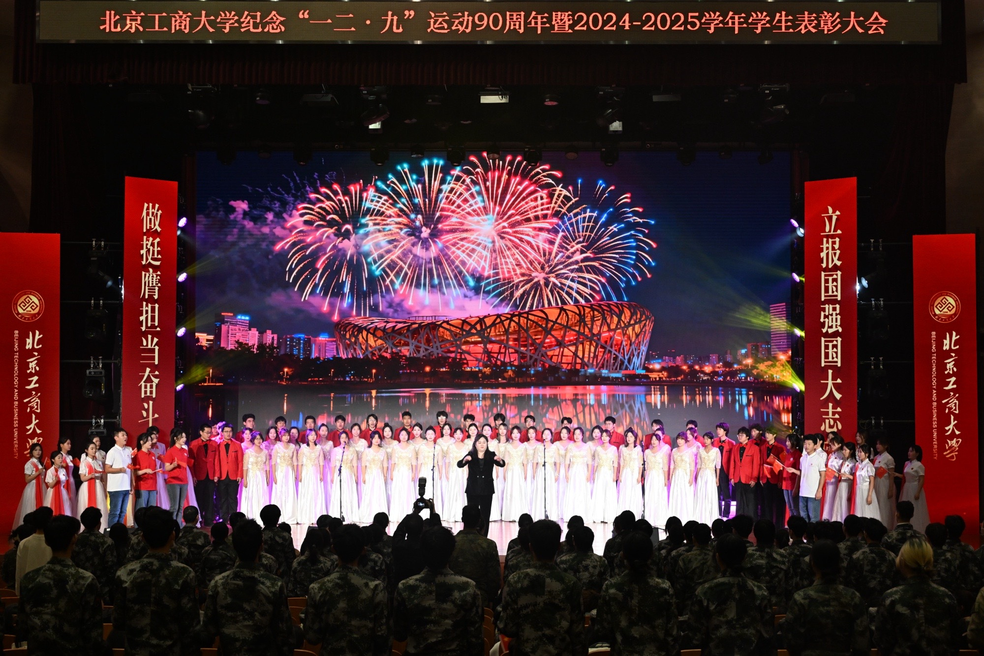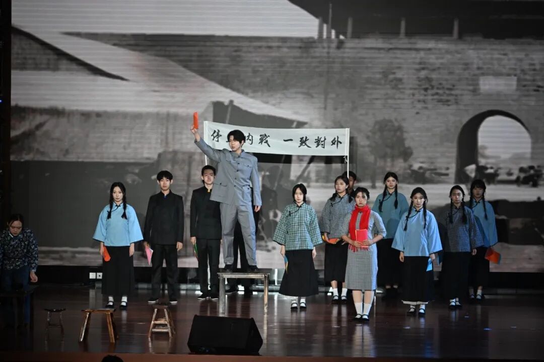 大會在首部校史舞臺劇《炬火相傳:青春的誓言》中拉開帷幕。該劇以北工商的紅色校史為依托,以老校長姚依林為精神符號,藝術化地再現了“一二·九”運動中的真實歷史瞬間,以實際行動踐行著“請黨放心,強國有我”的青春誓言,描繪出北工商青年弘揚偉大抗戰精神、與工商共成長、與祖國同奮進的動人圖景。這份跨越九十年的青春熱血與愛國赤誠,引發全場強烈情感共鳴,掌聲經久不息。