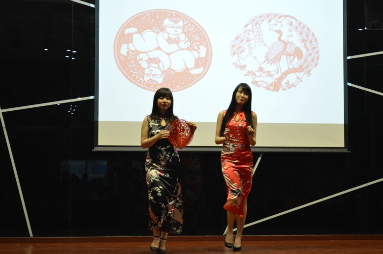 主題活動主要分為 “我最美”自我介紹、大洲最美風采秀、文化互動零距離三個部分。活動現場掛滿了各國國旗,文化視聽盛宴就此拉開帷幕。各組成員用英語、法語、韓語、漢語等多種語言進行“我最美”自我介紹,使觀眾在一開場便感受到不同國家的文化魅力。亞洲組同學們的民族服飾走秀,小篆、行書、民俗剪紙,舞蹈《江南stlye》等將傳統與時尚結合使觀眾們感受到亞洲深厚的文化底蘊;歐洲組的同學們以薩克斯、吉他演奏與B-box表演開場,并為在場觀眾帶來了輕松歡快的舞蹈表演《瑪卡雷娜》(《Macarena》),使大家感受到了歐洲國家的獨特風采;非洲組為大家表演了吉布提傳統歌曲《Rahma Rose》,科特迪瓦民族舞蹈《Balaumba》,向觀眾展示來自非洲的濃烈熱情。活動中,各組隊員還制作了韓式泡菜炒飯、德式煎土豆及非洲古斯面等多種美食,與全場觀眾一同分享制作過程。學習民族舞蹈、共同演唱歌曲、品嘗特色美食使觀眾零距離文化互動,從多個角度感受東西文化碰撞,體驗國際文化無國界。