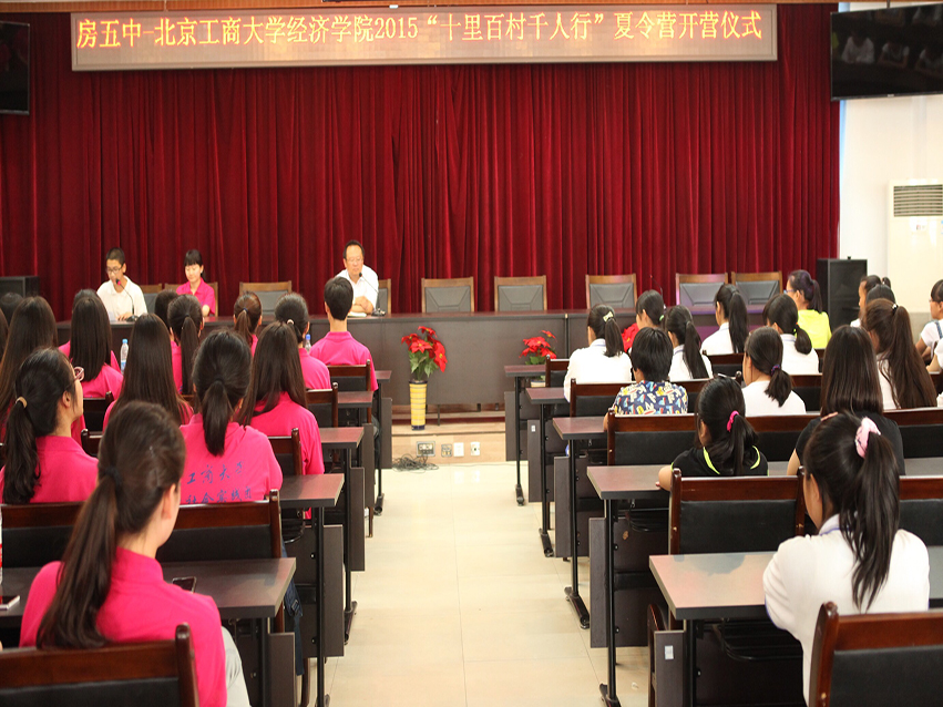 到達(dá)房山五中后,兩校舉行了簡(jiǎn)短的開(kāi)營(yíng)儀式。在開(kāi)營(yíng)儀式上,雙方學(xué)校學(xué)生代表發(fā)言,希望通過(guò)實(shí)踐活動(dòng)認(rèn)識(shí)社會(huì)、了解社會(huì)、開(kāi)拓眼界、鍛煉能力。經(jīng)濟(jì)學(xué)院感謝房山五中師生一直以來(lái)的大力支持,房山五中德育校長(zhǎng)毛玉革發(fā)表講話并對(duì)支教活動(dòng)給予高度肯定,希望大學(xué)生們能夠給初中生們樹(shù)立榜樣,激勵(lì)他們前行的意志,與初中生們共度一個(gè)愉快而有意義的夏令營(yíng)。