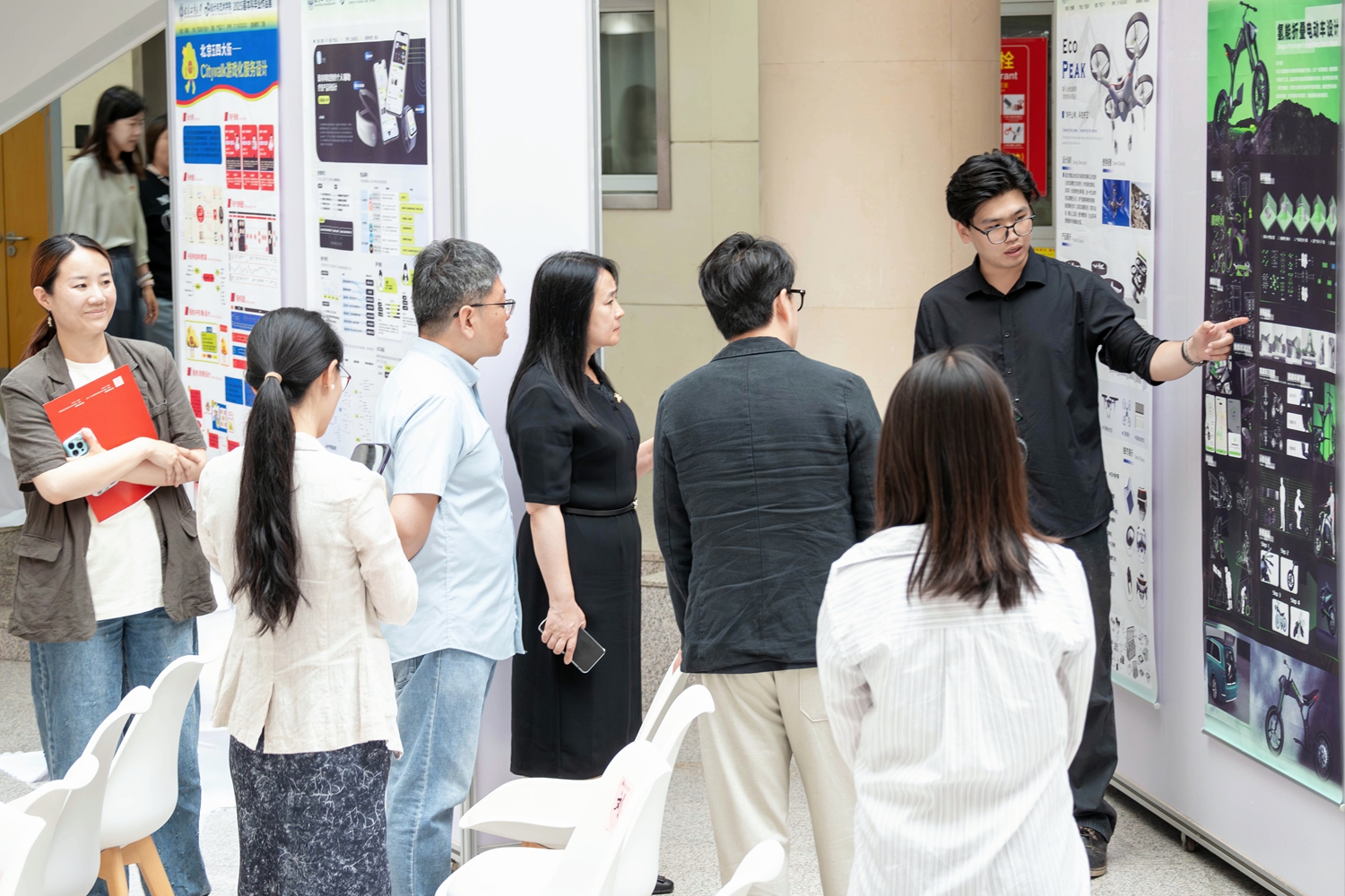 與會(huì)領(lǐng)導(dǎo)及師生代表共同參觀了創(chuàng)新服務(wù)成果與優(yōu)秀畢業(yè)設(shè)計(jì)參展作品,本次展覽分為三大展區(qū),凝聚了設(shè)計(jì)與藝術(shù)學(xué)院學(xué)生的120件作品。其中服務(wù)首都成果展區(qū)展出學(xué)院師生服務(wù)屬地、服務(wù)首都的創(chuàng)新成果,服務(wù)房山區(qū)數(shù)字化文旅設(shè)計(jì)方案、云居寺文創(chuàng)設(shè)計(jì)及2025年挑戰(zhàn)杯專項(xiàng)賽中的一等獎(jiǎng)作品,作品涵蓋人工智能、生態(tài)治理、文化創(chuàng)新、社會(huì)治理等領(lǐng)域。優(yōu)秀畢業(yè)設(shè)計(jì)展區(qū),集中展示了師生們?cè)谡n程思政實(shí)踐、專業(yè)能力提升與服務(wù)社會(huì)創(chuàng)新等方面的優(yōu)秀成果。朱慧教授指導(dǎo)的《五色觀下的端午節(jié)色彩體系建構(gòu)》以科學(xué)模型解碼非遺文化基因;李明靜老師指導(dǎo)的本科生韓軻《工業(yè)美學(xué)咖啡空間設(shè)計(jì)》,將科學(xué)邏輯融入消費(fèi)場(chǎng)景創(chuàng)新,打造用戶主導(dǎo)的沉浸式體驗(yàn)空間。此外,本次展覽特邀房山區(qū)攝影家協(xié)會(huì)參展,設(shè)置“光影京華”專題展區(qū),展出20余幅獨(dú)立創(chuàng)作的攝影作品,通過(guò)鏡頭語(yǔ)言生動(dòng)記錄鄉(xiāng)村振興成果與紅色文化底蘊(yùn),為展覽增添了多元視角,與學(xué)院設(shè)計(jì)成果形成藝術(shù)對(duì)話,拓展產(chǎn)教融合的實(shí)踐維度。