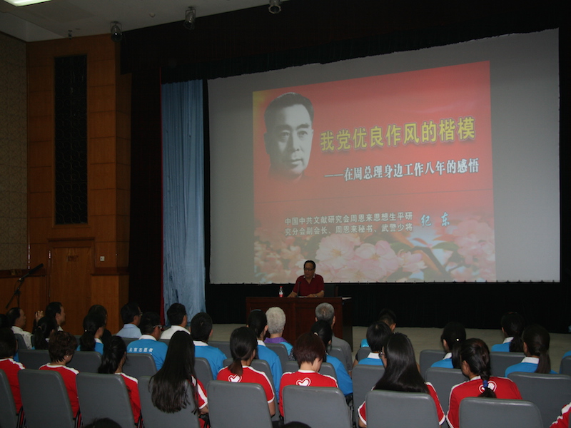 主題黨團活動中,大家首先向主席漢白玉坐像敬獻花籃,然后緩步走進瞻仰廳瞻仰主席儀容。隨后,大家進入二樓電影廳聆聽紀東將軍的報告。紀東將軍以《黨的優(yōu)良作風(fēng)的楷模—周總理最后艱難的歲月》為題,講述了從1968年調(diào)入總理身邊做秘書直至總理去世共八年時間中偉人生活的點滴小事,感人肺腑。紀東將軍從堅定不移的信念、甘當公仆的品格、嚴以律已的修養(yǎng)、最后艱難的歲月四個方面,以大量珍貴的史實和圖片,再現(xiàn)周總理的感人事跡,重現(xiàn)周總理的精神風(fēng)范。紀東將軍追憶了周總理在生命最后仍殫精竭慮、苦撐危局、鞠躬盡瘁的艱難歷程。紀東將軍說,他跟在總理身邊工作的這些年里從沒有見過總理休過一個禮拜天、一個節(jié)假日,甚至是過年的時候總理還是在辦公室里工作著,在總理身邊真切地體會到總理全心全意為人民服務(wù)的精神。在場的志愿者們都聽得熱淚盈眶,深切地感受到了一代偉人周恩來總理的堅毅和偉大。