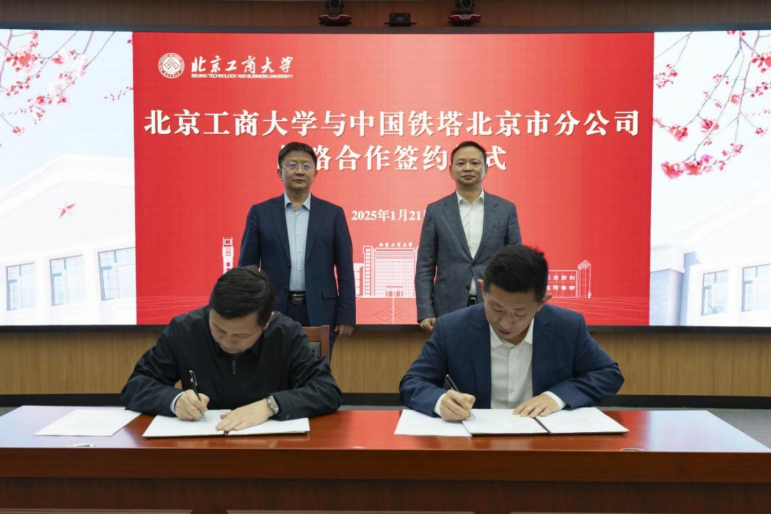 1月21日,北京工商大學-中國鐵塔股份有限公司北京市分公司戰略合作簽約儀式在阜成路校區舉行。中國鐵塔北京市分公司黨委書記、總經理耿時敏,黨委委員、副總經理程繼偉;校黨委副書記、校長郭建華,黨委常委、副校長寇紅江出席儀式。儀式由寇紅江主持。