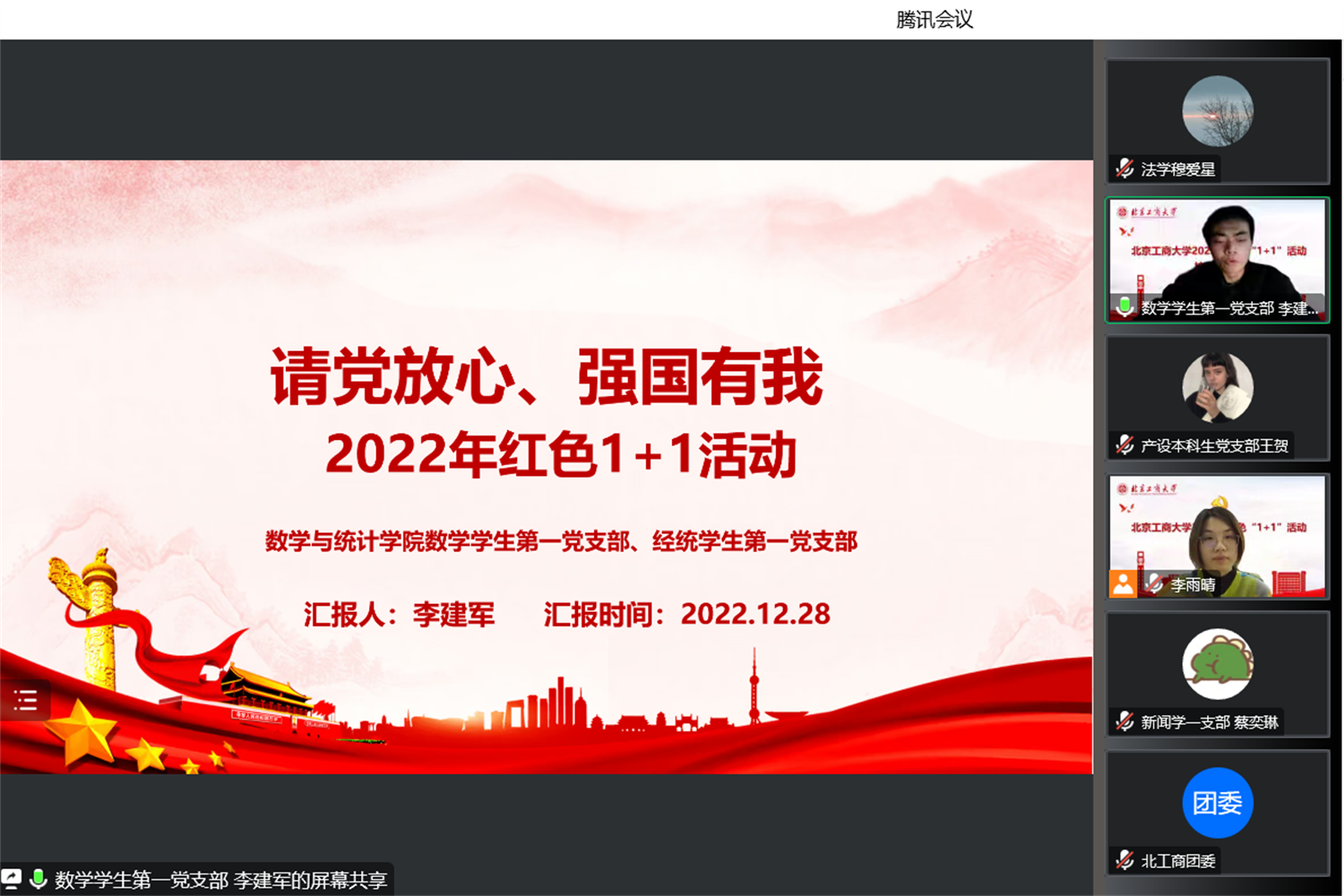黨委組織部副部長鄭光對各學院紅色“1+1”活動提出建議。他表示,紅色“1+1”共建活動是學生黨員深入基層、服務社會、厚植“泥土”意識的寶貴平臺,各黨支部要積極參與、認真謀劃、突出黨建引領、緊密聯系實際,真正做到活動有意義、共建有成效。學生工作部副部長蓋曉慶就今年紅色“1+1”活動開展情況進行點評和總結。她表示,今年的活動緊密圍繞黨的二十大精神學習展開,各黨支部能夠充分發揮學科優勢,結合共建支部實際需求,為基層單位建設發展注入實打實的北工商智慧。
